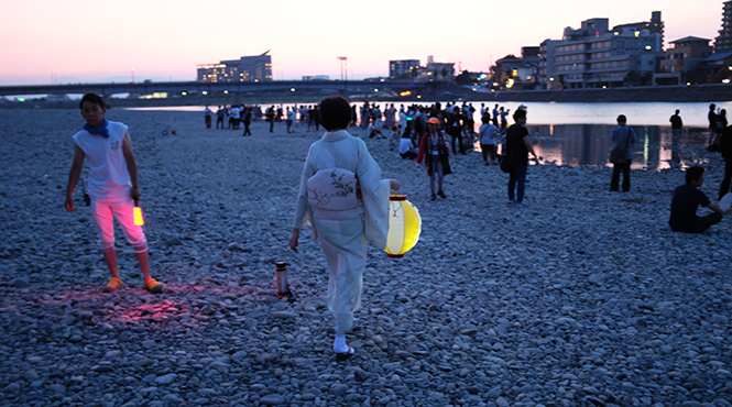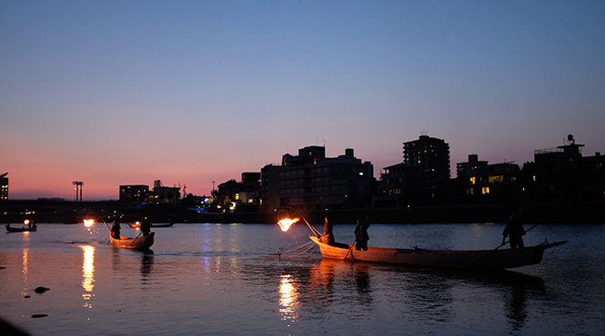 鹈饲也像是祭祀。据说应是登船驶向湖心,从船上观看,因今年台风骤雨,山上泥石堵塞河道,改为从岸边观看。晚餐后夜色昏昏,客人在旅店门前候车,一批批驶向河边。河边白色砂石,并不好走路,旅店老板娘穿着夏日浴衣提着纸灯笼在前方引路,足下是日式木屐,走起来倒是轻快。夜色迫近,长良川边人渐渐多了,往川上游看,只见数个火点摇曳临空在江上,仔细分辨,原来是六艘小船,船头悬着一团篝火,篝火挑出船身,远看倒像是半空中漂浮着火团,为渔船引路。待船驶近,夜色中,仍能见到船两侧鱼鹰游动,每一只都系着绳,绳的另一头聚拢在船夫手中。于是,漆黑水中行驶的小船,仿佛是被这些漆黑的鱼鹰拖拽着,鬼魅前行,令人不由想到冥河中的摆渡人。