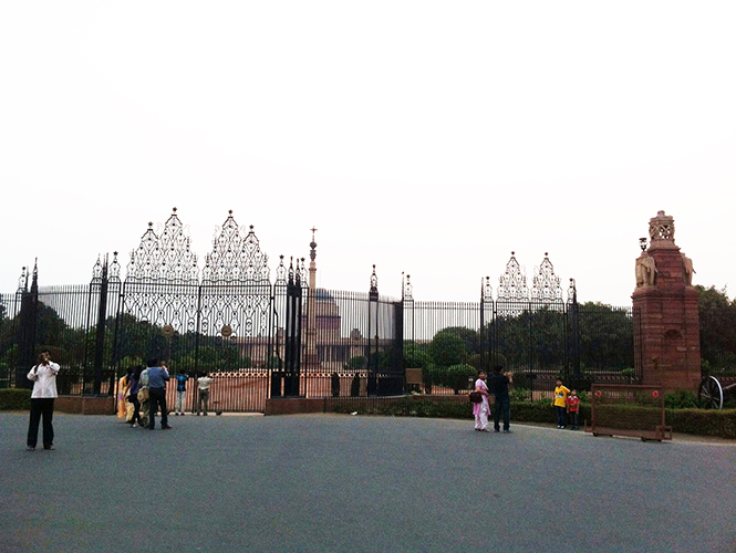 这座新德里的标志性建筑,倒也带着旧德里的传统色彩——红色的砂岩外观,在夕照下熠熠生辉。沿着印度门前面的国王大道(Raj path,又名拉杰大道)一直走大约2公里,就能到达总统府。据介绍,总统府始建于1929年,原名为维多利亚宫,是英国殖民时代的总督府,印度独立后改成总统府。这座位于顿西纳山丘上的宏伟壮观的宫殿式建筑由英国建筑师设计,在呈现英国维多利亚时期建筑风格的同时,还融入了印度传统的莫卧儿建筑特色。可惜我到总统府时是傍晚,大门已闭,如想参观需要提前网上预约。不过,在铁门外还是能一窥总统府的概貌——既贾玛清真寺之后,再次在门口“打卡”参观完毕。总统府两旁,还分布着外交部、国防部、议会大厦等政府机构,看起来都气势宏伟、整洁有序,和旧德里那些逼仄的街道、破旧的民房仿佛两个世界。