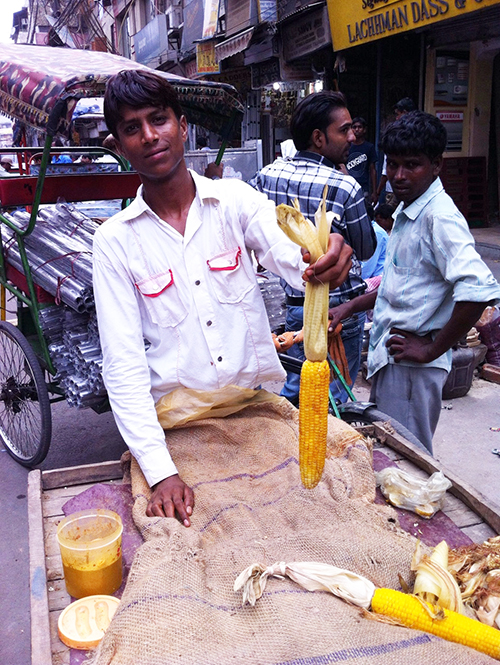 通往清真寺需途经旧德里繁忙的市场街Chawri Bazar Road,人潮汹涌,只能挤着人缝儿走,看到街边卖玉米的摊儿却不由自主地停下来。小贩在热闹的街上卖力吆喝,小木车上的麻袋捂盖着已烧熟的玉米,顾客需要时立马掏出一个抹上辣椒盐。德里街头充斥着这类看起来卫生状况堪忧的小吃,肠胃娇贵的人往往很难适应这种“野生街头美食”,不过我还好,既然印度人吃得我自然也吃得,或许正是这种推人及己的心理建设,让我能够更放松地接受各种可疑的食物,而印度小贩看到老外能够欣赏他的美食,往往也开心。因此,当我问玉米摊小贩能否给他拍张照,他毫不犹豫地答应了。