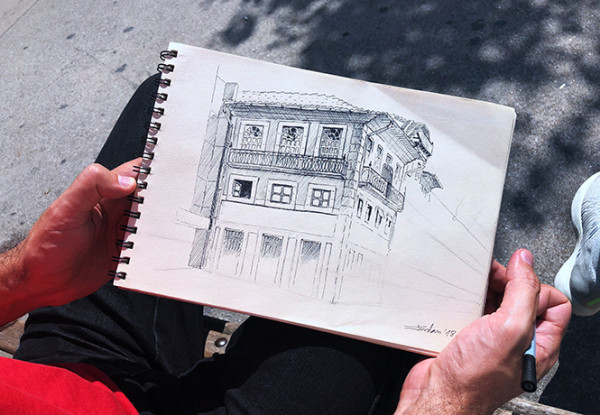 Jordon是伦敦人,来葡萄牙一年半了。在伦敦时画画的收入是1小时100欧元,在这里少得多,但他喜欢波尔图的阳光。我们一边画画一边聊天,街边一栋很典型的小楼,逐渐在纸上呈现出轮廓,再渐渐添加细节。他的胡子白了,所以我将他的年龄猜老了许多,于是我们聊到人的年龄,说到英国人比葡萄牙人显得年轻,因为葡萄牙有更多的阳光,人们脸上也有更多的微笑。Jordon说,他在葡萄牙也不会一直待下去,哥哥在苏格兰买了一座教堂,打算提供哈利波特主题的婚礼或聚会服务,他要去帮哥哥忙。“可是,我真的好喜欢这里的阳光啊,也许冬天还是会回来。对了,你能将这次的游记发给我吗,中文没事的,我可以用google翻译。”