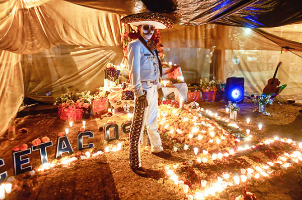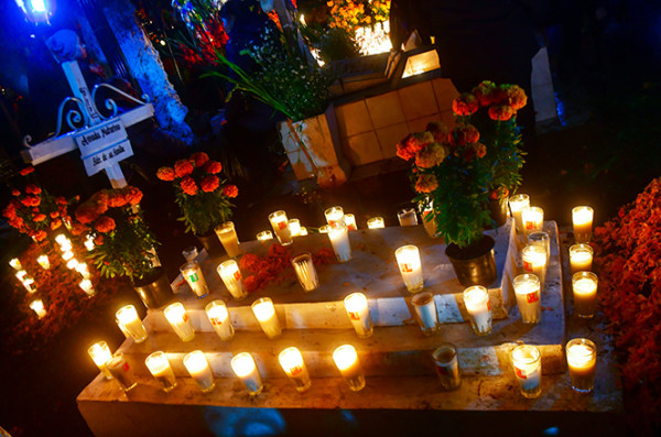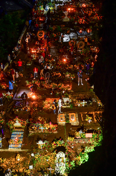 在中国,人们都会忌讳在墓地里转悠,更别说在晚上造访,也不会对着墓地拍照摄像,但墨西哥人把墓地看成是他们已故亲人的家,在亡灵节这天更是非常漂亮的家,所以完全不会介意游客拍照,墓园里时不时亮起相机手机的闪光灯。如果说中国的习惯是不去打扰死者,那墨西哥人坚持的就是与亡灵团聚狂欢。亡灵节没有哭泣和悲伤的阴影,所有人都欢乐祥和,他们精心布置墓地和祭坛,放上五颜六色的鲜花和糖骷髅,眼花缭乱的私人悼念物品,然后点起成百上千盏蜡烛,整夜守在逝者的墓旁。
