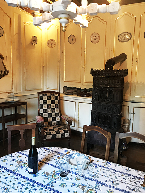 Gérard给我们欣赏了家族收藏的一些老衣服,它们放在柜子里,叠得整整齐齐的,Gérard先是小心翼翼地拿出来一个大概是18世纪的宫廷玩偶,非常精致,像是给孩子玩的,玩偶身上还挂着许多小铃铛,它穿着红蓝相配的外套,红色的裤,戴着黑帽子,头发打卷,穿着当时流行的尖头鞋,鞋上缝着粉红色的绢花。他又拿出另一个女娃娃,这个没有那么精致,但是它的粉红色长裙也特别漂亮。Gérard一件一件把那些老衣服从柜子里拿出来,让我们欣赏美丽的花边、刺绣和布料。每看完一件,就要叠好再放回去。我试穿了一件18世纪的男款风衣,居然如此合身,像为我订制而成。