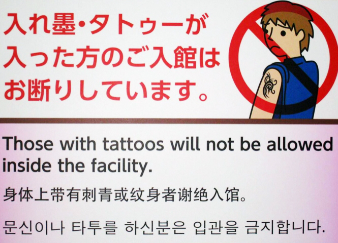 早年,某机构曾经调查了全日本的温泉场所,公布的数据显示,56%的温泉馆拒绝有纹身的客人进入,31%的允许进入,13%的表示如果客人可以遮盖住纹身,则可以进入。此数据公布后,一些旅游业相关人员呼吁“日本温泉是外国游客喜爱的旅游项目之一,经营温泉的场所应该消除偏见,让外国人感受到日本人的热情好客,而不要因为纹身就把客人拒之门外。”但同时又补充道,该建议不包括那些有纹身的日本人。
