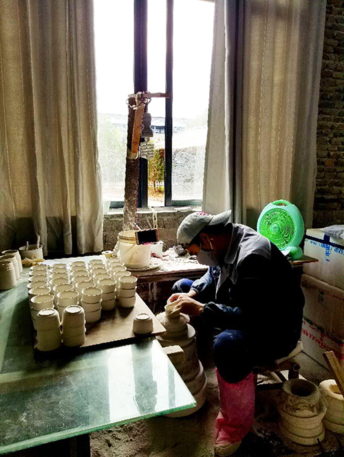 车间里还有各种我叫不上来名字的工序,工人们听着音乐做工,是不是心情愉悦的人做出来的产品都会别样美?在我这个外行人看来最辛苦的应该是一个打磨的小伙子,一个个胚胎经过他的手变得光润水滑,小伙子很帅气,戴着大大的口罩。艺术家姐姐张老师跟我说不要小看这个小伙子,人家有好几套房子,而且这种手艺人年纪越大经验越丰富收入越高。我是真心佩服小伙子的手艺的,但是内心里总觉得他其实也很可怜,我们每天高喊什么PM2.5,他每时每刻吸入的不正是不可吸收不可排泄的胚胎粉尘颗粒吗?《人鬼情未了》中制胚的浪漫,是艺术,不是生活。