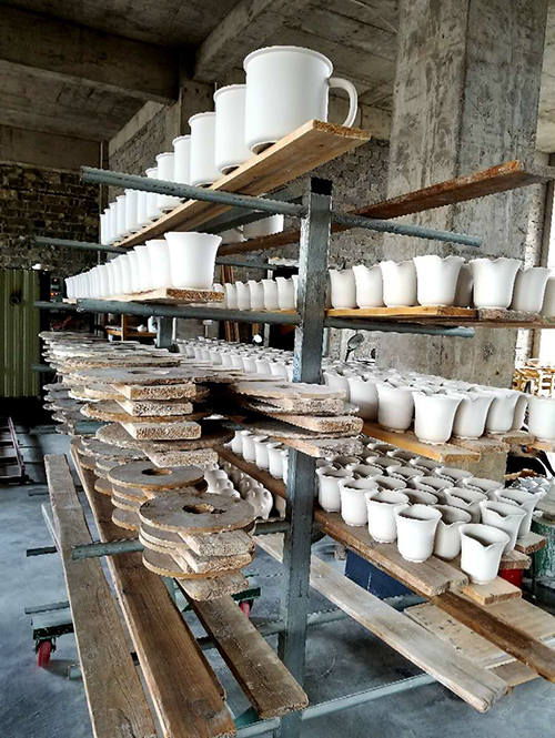 工厂不同于景德镇古窑。古窑是供游人参观的场所,在那里虽然可以看到瓷器从泥土到成品的全过程,但毕竟以游客为中心,除了“只可远观而不可亵玩”之外,因其用途主要是展现,让游客了解烧瓷过程,所以跟真正的工厂比,规模也小了很多。工厂则是接了订单真真正正生产生活用品或艺术品的地方,场面宏大。一走进车间,我就被震撼到了。各种形状的胚胎,按照模样,整整齐齐地摆放在一排排架子上,胚胎为乳白色,就像一个个刚出水的二八姑娘,水灵灵地站在那里,等待你给她们穿上不同的服装,浴火重生后,脱胎换骨,成为不同的产品,多像人生。
