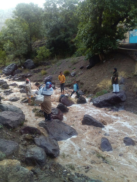 回客栈的路上,一段路被水淹没。急流从山谷奔下,经过路面,冲下山崖。几位柏柏尔妇女在路边等着,虽然水不过及膝。她们不可能提高裙襟。