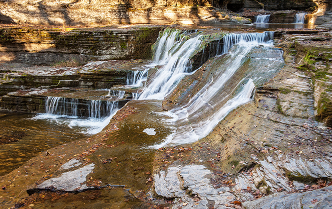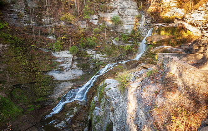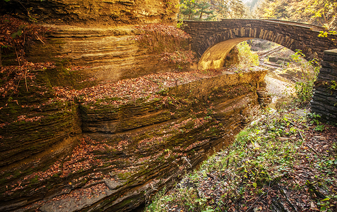 沿着公园长达7.2公里的双程徒步道散步,会有数不清的溪流和瀑布相伴。据说徐志摩在康奈尔大学留学时,也曾到这里徒步和野餐。我们在一个清晨到达那里,就像约翰·缪尔所说的,“一个万物复苏的清晨”,在《夏日走过山间》那本小册子中他曾经精彩地描写过森林世界:“阳光毫不吝惜地洒在绵延的山坡上,照射在苏醒的松树上,让每根松针都欢快起来,让每个生命都愉悦无比。”这愉悦的生命也包括我自己。登山步道沿恩菲尔德溪方向延伸,直到恩菲尔德峡谷深邃狭窄的山中地带,奇特的岩层和古老的石桥为郁郁葱葱的森林增添了不单调的魅力,一个天然游泳池位于最东端的瀑布之下,被称为下瀑布,即使森林公园冬天被雪覆盖,下瀑布和泳池仍然不会冰冻。那里就像康奈尔大学和康奈尔这个城市一样,拥有永远向前的活力。