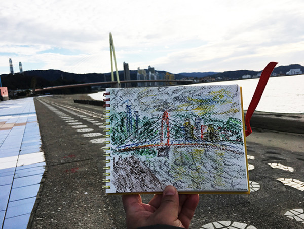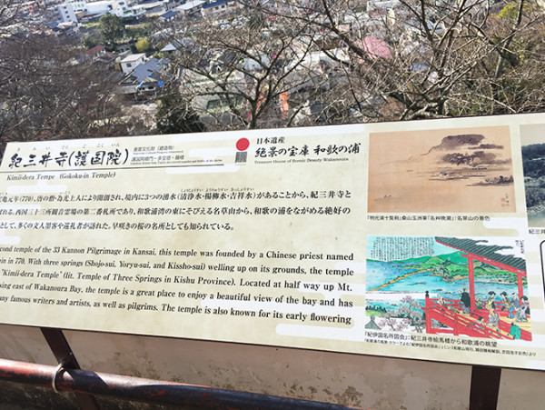 往回走,顺带逛了逛“纪三井寺”,别看初时我嫌人少,可新年的寺庙向来香火鼎盛,走出另一边站口就见到了“初诣”的人群。穿和服的一路上只看见一家人,另外还有一个穿短袖短裤的老外,印象深刻。人一多,我就心慌,纯粹为“溜食儿”,远没了昨晚的诗意。这里因“吉祥水”“杨柳水”“清净水”三口井而得名,乃唐朝僧人为光上人所创,可凭栏远眺“和歌浦”——纪三井寺对面,这也是其风雅的原因之一。它曾出现于古老的“万叶集”中,不少文人墨客喜好来此游玩,沿海岸坐落了许多历史悠久的建筑物,当天下午,晴转多云,依然可见——水何澹澹,山岛竦峙,树木丛生,百草丰茂。只是多天以后我在和歌山县立美术馆看到了不少描绘“和歌浦”的旧画,不得不感叹到底还是古人赶上了好风光。
