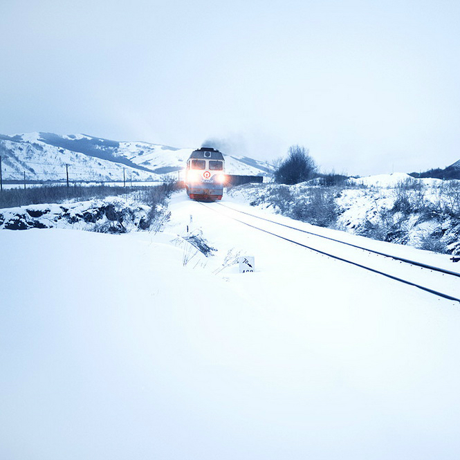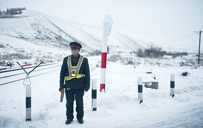 出山的公路上。老刘负责火车快进站时,放下警戒杆,并维持交通秩序。火车带来一阵凛冽的风。老刘说,这个路口是全阿尔山最冷的地方,而他已经在这每天拉杆好多年了。火车开过,老刘拉起警戒杆子,小步匆匆跑回值班的小小铁皮房。