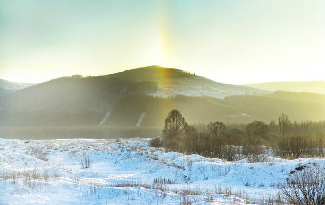 冬天山区里常见的奇异光影,像一道垂直的彩虹从天而下。