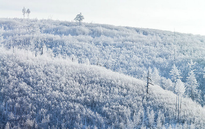 到了稍高一点的山,满山的树林都是雾凇的景象。