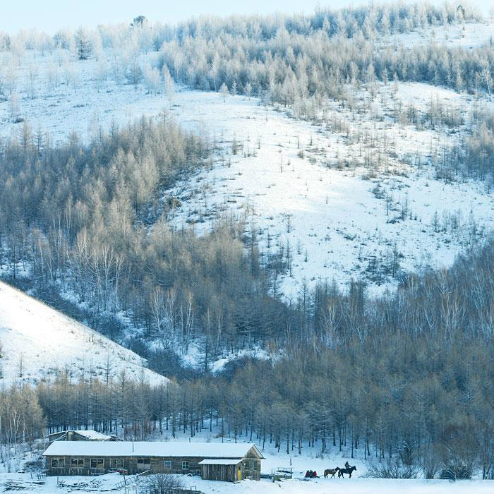 阿尔山的冬天,到处一片寂静,几乎很少看到人类的活动,只有漫山遍野的雪淞,洁白的雪地上全是兔子狐狸跑过的足迹。游客几乎没有,当地人也甚少出门,夏季为接待游客准备的旅馆餐厅,也基本都关门打烊了。只有偶尔一两座雪房子,会冒出炊烟,升起在阳光照射得熠熠发光的雪原上,更显落寞。