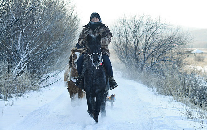 经营马拉雪橇生意的老李,冬季生意不是太好,无聊的时候他就骑着马绕着山疯转两圈解闷。