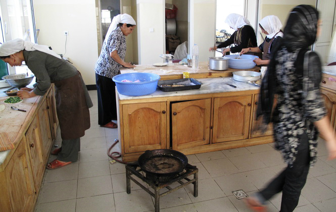 出于对做中式馅饼的好奇,我擅自闯进了厨房,里面有六七个女人正在揉面、包馅饼,看到我拿着相机进门,顿时一阵慌乱,逃的逃,躲的躲,瞬间厨房空无一人。我站在原地,摆着举相机的姿势,尴尬得有些不知所措。赶紧把瓦黑德招呼进来,女人们看到有男人进来,更是乱了方寸,纷纷逃离了厨房。