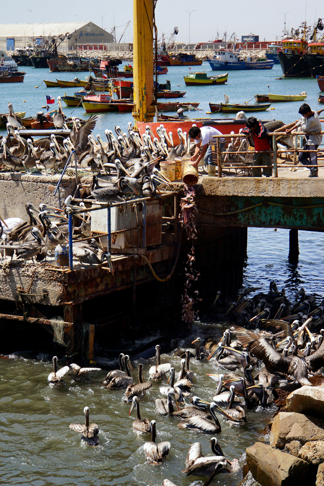 一进阿里卡(智利北部边境城市),听说海港很多鱼摊,可以买到新鲜的海胆,我们于是直扑过去,海胆已经售罄,卖鱼的大叔拎着一个巨大的铁皮桶说:“你们想看好玩的吗?随我来”,于是走不了几步,看到了大群的海豹和鹈鹕向岸边聚集过来。他们似乎和大叔很熟。大叔向海里哗啦啦倒出一堆堆鱼头和鱼尾,然后海里便是“过节”的气氛。智利人买鱼只买鱼中断肉,在中国老饕们看来,鱼眼下的那块肉才是最鲜美的。