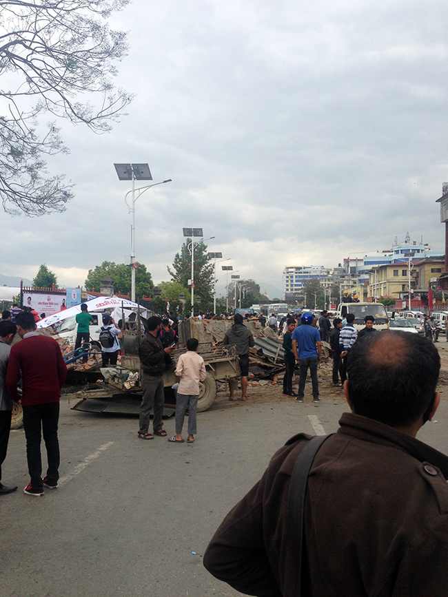 当我们走到尼泊尔新皇宫,背靠美国大使馆的那条路的时候,我告诉Khan,这里是可能是我觉得最安全的地方。让我安全系数倍增的是, Khan的朋友以及一辆载着中国人的大巴在这里停靠。在与Khan的好朋友Sam的交谈中,我得知Sam 在杜巴广场的经历。地震的瞬间,地动山摇灰飞烟灭。喧哗变成惶恐,古迹变成废墟,世界都像是被颠覆了。看着身边的人一个接一个倒下,他甚至不知道自己怎么活下来的……他是克什米尔人,经历过战争,遭受过贫穷,也曾在大洪水中死里逃生。可这次地震,却是他认为经历过的最糟糕的天灾。