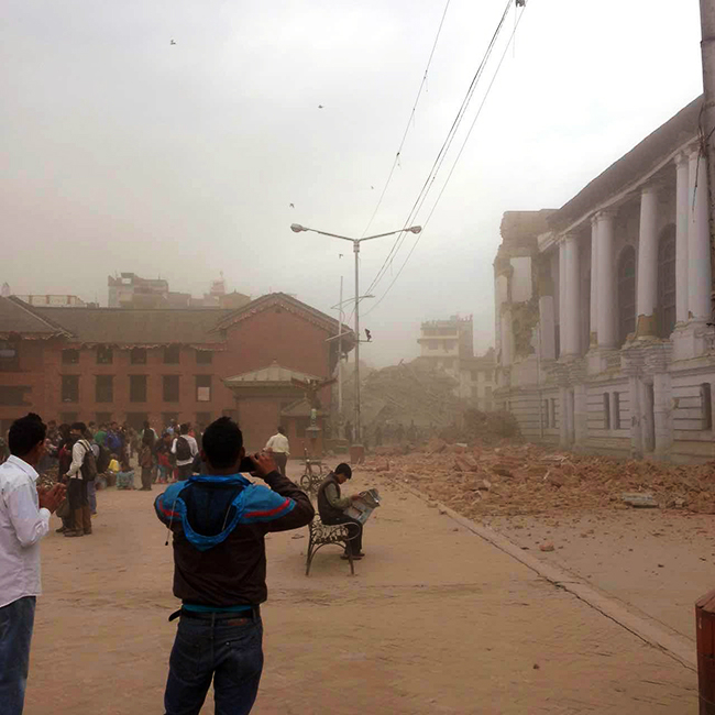 轰的一声,座椅开始不自然的前后摇动。脑子被刺激的飙车场景占据的我,还在心里赞叹着尼泊尔电影院绝佳的3D效果,却被Khan大喊的“Earthquake!”拉回了现实,所有人都意识到地震来了。他们尖叫,呐喊,一个个冲出影院。从未遇到过这种情况的我,在突如其来的慌乱中不知如何是好。只有他紧紧握着我的手,护着我的头,带着我生生的从人群中挤出来。到达大厅时,Khan一脚踹开紧锁的紧急出口大门,我们一路跌跌撞撞的从楼梯上连跑带爬的下来。随着楼层的下降,我的眼中充满越来越多的墙体碎块,玻璃碎片和大片的血迹。这一切让我透不过气来。《速度与激情7》的场景突如其来的发生在了我的身上,真实的让人后怕,全身颤抖……(截止到2015年4月29日12:57分,我得知在我们所处的Mall里有45人死亡。)