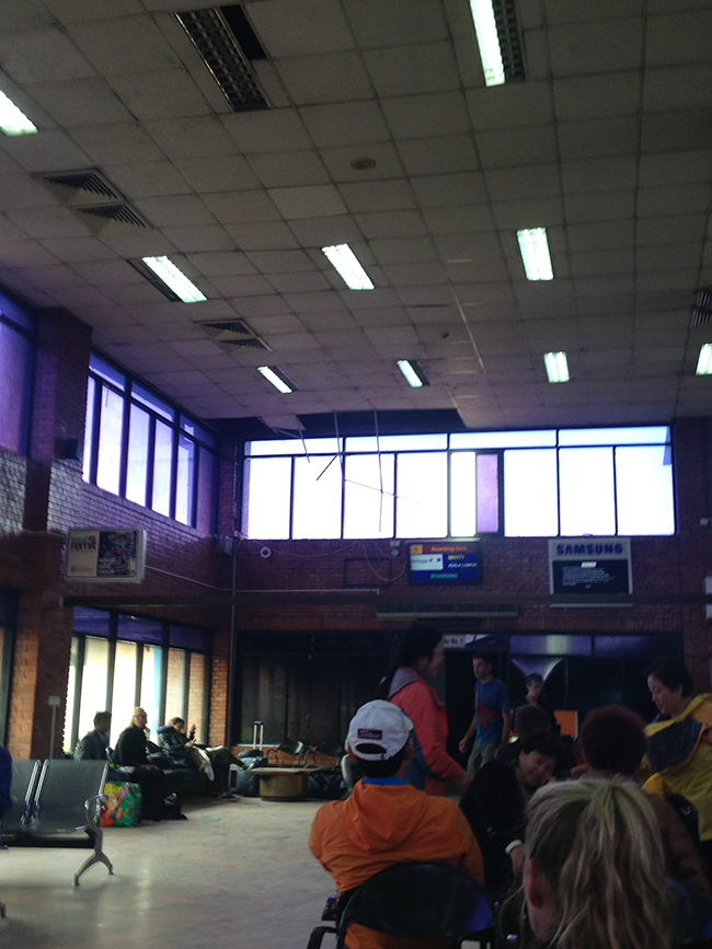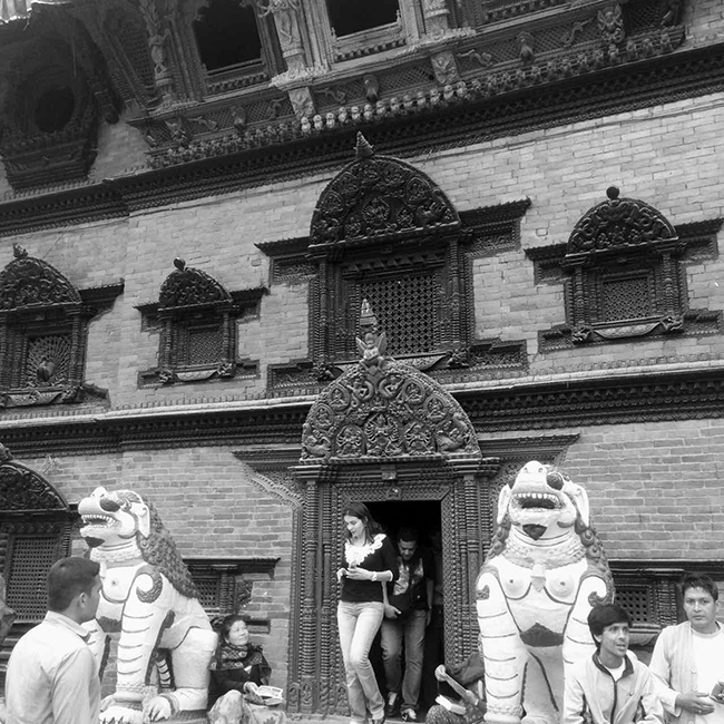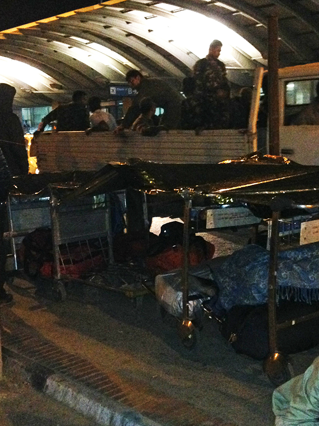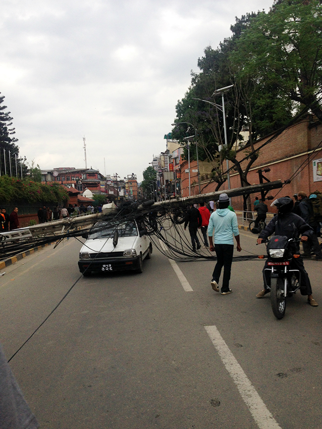 无家可归的我们,在街上漫无目的的游荡。在腿脚已经机械到没有感觉的时候,Khan提议去Annapurma Hotel ,当地最好的酒店之一。在那里我们得到了毛毯,椅子。此时还坚守在自己岗位上的工作人员,用所剩不多的补给品安抚着大家不安的情绪。躺在椅子上的那一刻,我听见了盘旋在上空的乌鸦呜咽声,好过那让人更害怕的安静。那一刻,我对“度日如年”这个词第一次有了感同身受的理解。一次次的余震让我不敢合眼,让所有人像受了惊的鸟儿一样奔跑……凌晨一点左右,我遇到了20人一行的中国游客。他们告诉我,现在最好去机场,在那里等候救援。仓惶收拾过后,我们5个人挤在一辆小小的铃木上。在这个昔日热闹非常而现在却是死亡地带的空间里,一切似乎都没有改变,改变的却是我们内心愈加的恐惧。