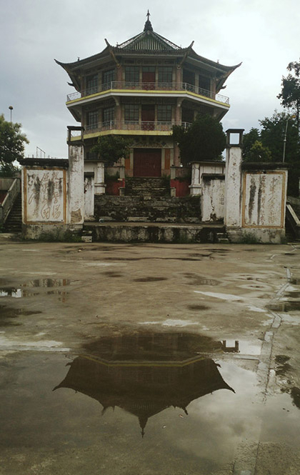登上知子罗最宏伟的建筑,铁皮阶梯的尽头散落着几个啤酒瓶,远处的青山在浮云变幻中若隐若现,迎面而来一阵亚热带山地特有的季风,面前是人去城空的广场,毛主席头像和语录还斑驳可见,墙壁中的裂缝杂草丛生,这里早已成为末路。