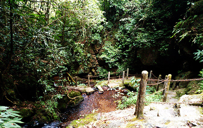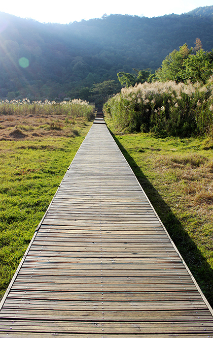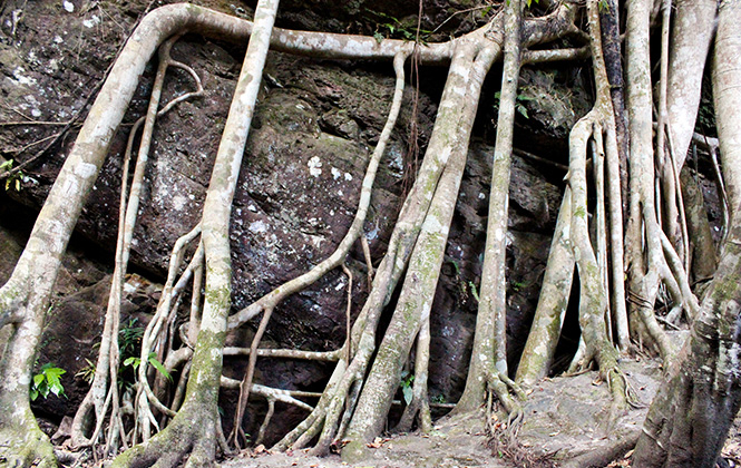 勐梭龙潭是典型的热带雨林湖泊,公园里修葺的人行道环潭而行。这是个公园,也就是当地人饭后散步和锻炼身体的地方,沿着木栈道向里面走去,很多当地人都在跑步,问起龙摩爷在哪总有人热情地为你指明方向。可这也不像个公园,有些小路甚至不亚于一般的徒步路线,虽称不上险峻可也要费一番功夫,树枝和树根有着千奇百怪的样子,痴缠难断的藤葛和湿滑碧翠的苔藓形成了天然“路障”,真的需要小心翼翼才能从中而过,而神秘的龙摩爷圣地,就在跟公园相接的阿佤山深处。