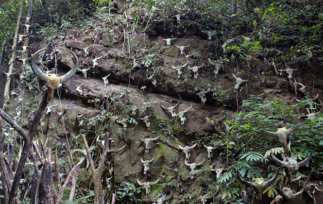 慢慢迈上最后一级台阶,就到了灵魂的殿堂——眼睛所能见到之处全被白骨森森的牛头占领,树上、峭壁上、木桩上、地上、水里,许多牛头由于时间的洗礼已经和山崖青苔融为一体,旅行到此为止,已不再是视觉享受,这强烈的冲击带来的心灵震撼让我一句话也说不出来,据说这里存有3000多个牛头。