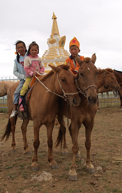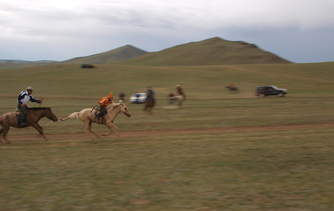 没多久,Ada的领导又叫我们上车赶路,说赛马快要开始了。赛马场离小镇更远,我们开了一个小时的车,经过每个蒙古包和牧人,领导都问问路。当地人也不太清楚怎么走,好在最后还是到了:一块比周围的草原稍微平坦一点的地,中间有个塔,围着塔有一帮骑着马的小屁孩,最大的不到十岁。我们刚给眼神最淘气的孩子拍了照,他们旋即就都骑到远处,远得看不见,谁回来最快谁就赢。和我们一起等孩子的父亲心急火燎地骑着马转来转去,等了半天才能看见第一批在原野上跃马的孩子,领跑者就是那最淘气的小孩!