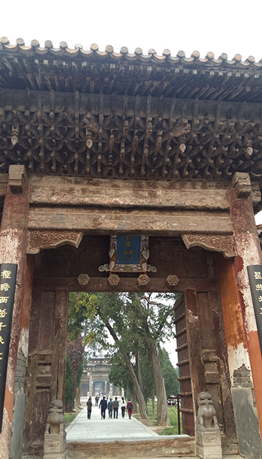 我们先高后低,沿神道先登顶拜陵,后下山祭轩辕庙。黄陵冢是衣冠冢,冢前有祭亭,陵前立有明代四字石碑:桥山龙驭,表示此为皇帝驭龙升天处。陵冢是扁球状土冢,方形墓台,围以砖墙,寓意天圆地方,天地相合。我们在祭亭前认真走完一遍祭拜程序。