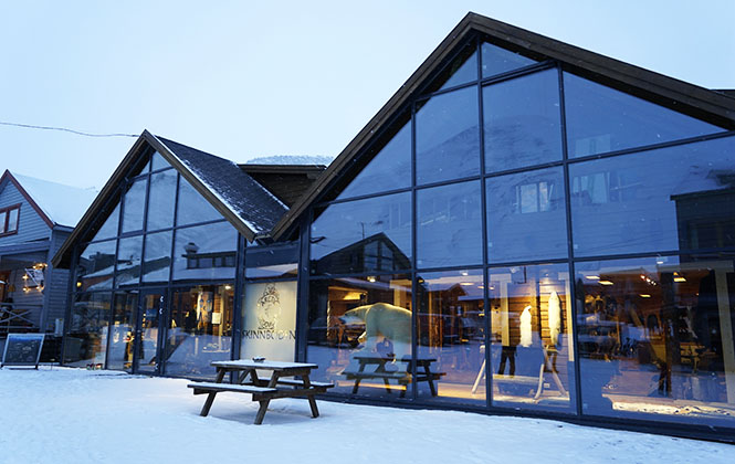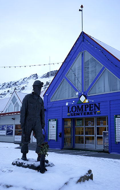 然后我们在大雪纷飞的夜色中去朗伊尔城区随意晃荡。说是城区,其实就是一条街,左右有一些商店、邮局、超市、酒吧和旅馆,顺着主路漫行,便能在那间唯一的超市外面看到一个矿工的雕像,在雪夜昏黄的路灯下,他是那样的坚毅寂寥。想想看,百多年前因为矿产资源而来此掘金的人们,心中该是拥有多少发财的沸腾热血才能在此坚守。雕像是黑色的,朗伊尔城的建筑都是彩色的尖顶屋,四处都是皑皑白雪,还有“北极熊”。据说斯瓦尔巴德群岛上拥有超过5000头北极熊,数量超过了居民,地图上也有显著标识,注明了哪些地方不可以独自前往,因为,如果遇到北极熊,赤手空拳的你将无路可逃。另一个有趣的说法则是朗伊尔城无处不见北极熊,从机场到城区,几乎所有的商场酒吧旅馆最显眼的标识,都是北极熊。后来我们还在路边看到了一个不锈钢制作的北极熊城市雕塑,在大雪中泛着清冷透寒的光……