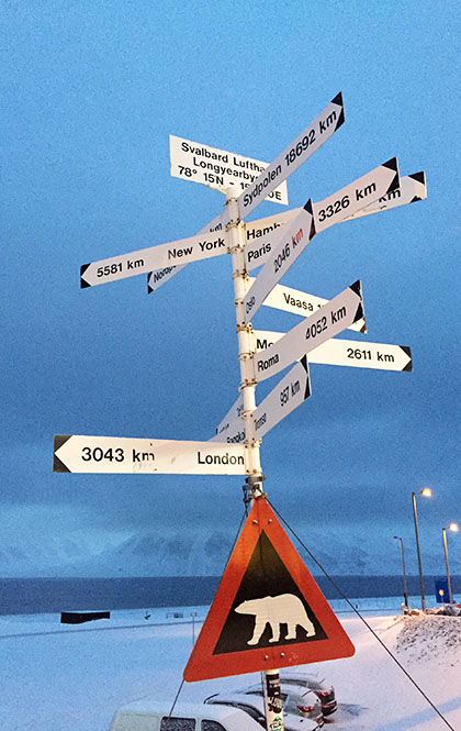 到朗伊尔机场不过午后三四点,却已是天色向晚的模样,我们在小小的机场外面等巴士,却又被路边的一块指示牌吸引。那是一块分别指向不同方向并注明距离某地多少公里的路牌,类似的路牌我们在各地当然经常见到,可是这里是北纬78度啊,这里是北极啊,当看到那些“Roma 4052KM”、“Sydpolen 18692KM”的字样,我们终于觉得是真的到了北极,这里可真远啊。