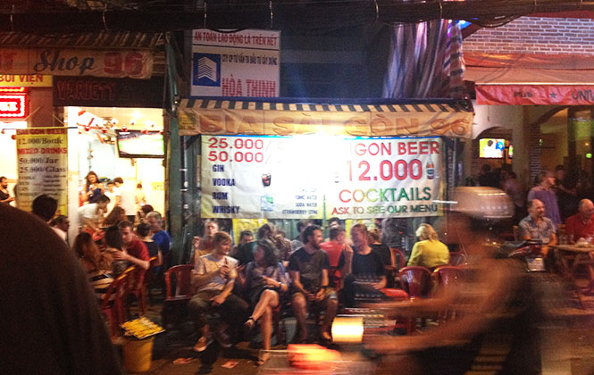 去喝一杯其实只是Priya和Elson的主意,两个新加坡人从早晨第二次见到我就开始嚷嚷了,组织一场party似乎才是他们到西贡的首要任务……问了下同屋的韩国姑娘Narae要不要加入我们,前台的姑娘警告夜里有飞车党抢劫,在游客聚集的范五老区夜里状况加倍复杂,怎么办?两手一摊但该high的时候还是要high,约到的新朋友们陆续续到齐,出门。