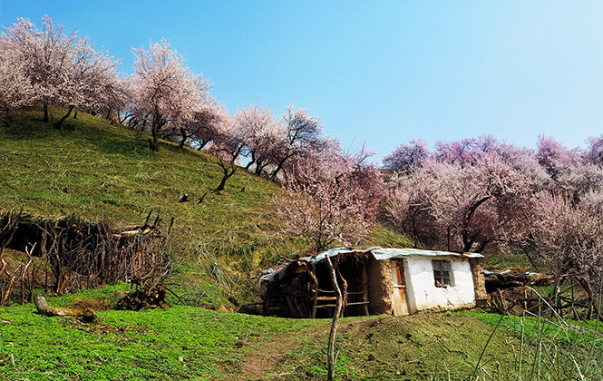 往年在4月中旬,吐尔根乡朝阳的山坡上杏花便开始打苞和开花,野杏树覆盖整个半山腰,在初绿的背景下,被鲜嫩清淡的粉色所渲染,从平原河谷渐次开放到山坡上,杏花有变色的特点,含苞待放时,朵朵艳红,随着花瓣的伸展,色彩由浓渐渐转淡,到谢落时就成雪白一片。可今年的春天仿佛一夜之间就将临了,于是杏花们来势汹汹地爬上山坡,越过山顶,深入沟谷,开得气势磅礴。