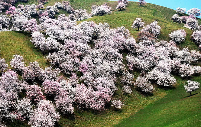 这是一片源自中世纪的原始野杏林,因山地河谷的冬季逆温气候而遗存至今,连绵起伏的山脉间,生长着数以万计的古老杏树,它们的组合分布方式不尽相同,每一处都自成一幅巨画,放眼望去,除了杏树竟不见一棵其他树木。