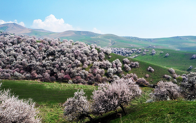 吐尔根杏花沟位于伊犁哈萨克自治州新源县吐尔根乡,是新疆野杏林最集中的地区之一。吐尔根是以哈萨克族为主要居民的乡,从伊宁市出发,驱车沿着218国道一路向东行驶,在白色雪山和绿色草地的映衬下,远处的哈萨克族牧民骑马而来,点缀在他们身后的,便是像云朵一样漂浮在山间的杏花。