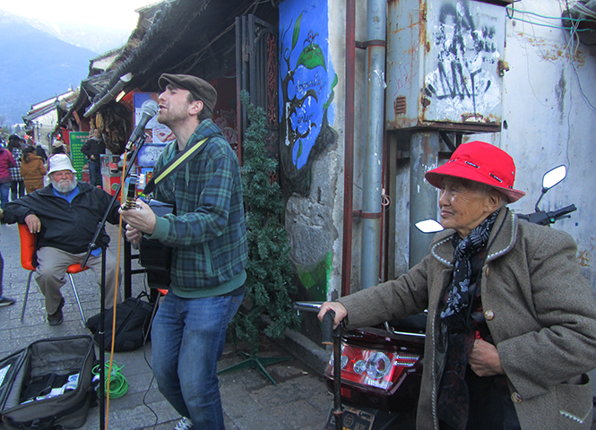 我从小弹吉他,但是我知道我的水平不是第一级的,所以我从来没有试过分享我的歌。在大理我感觉只要我快乐,我的歌就会带来快乐。一天我决定买话筒和音响在路上唱歌。我没有想到会这样开始一个歌手的生涯,也没有想到几年以后我会在大舞台唱我自己的歌。
