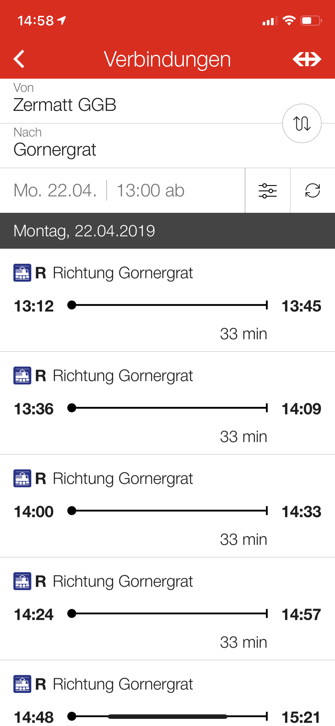 自驾只能开到“塔斯”,然后乘火车至采尔马特GGB,出火车站过马路街角就是格内尔格拉特观景台的火车售票处!间隔24分钟发一趟车,车程33分钟,票价38瑞郎,如下图:另外还有冰川天堂和罗特洪峰线路可供选择!
