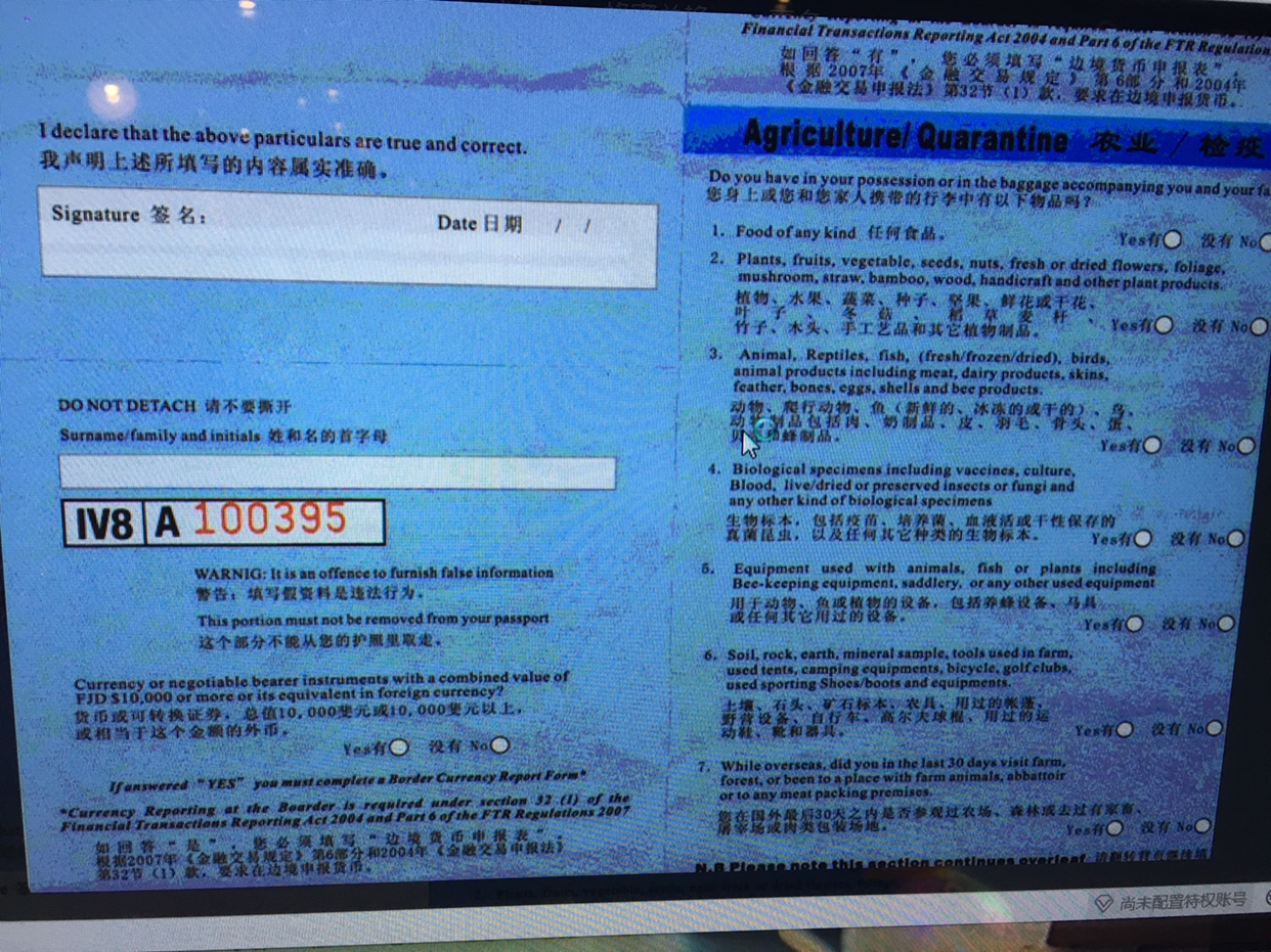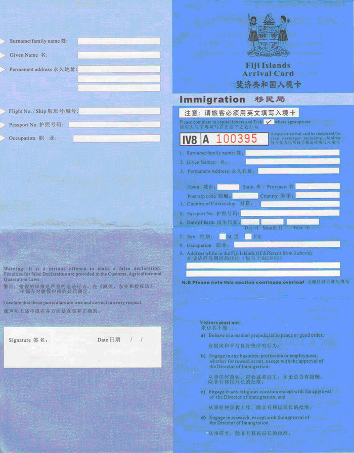 游客在抵达斐济前,请填写好入境和海关申报表;抵达后,入境旅客须持下列文件去移民局柜台办理入境手续:1、本人有效护照2、有效往返机票,或途径国,目的国签证3、填写完毕的入境和海关申报表▲斐济签证四、出境的注意事项1、游客须交纳30斐济元的机场建设费2、出示过境第三国期间最低400美元...显示全部