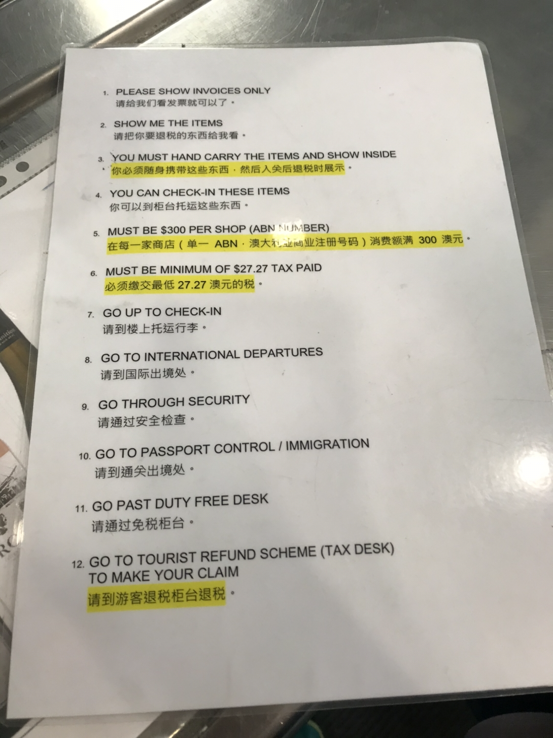 你在一个店里累积消费超过300刀(含税)都可以退税,也就是说只要是同一个ABN码就可以。你可以在手机上下载个TRS APP,这样你要离开墨尔本的前一整理一下你的小票,输入进去,它最终会生成一个二维码,凭此二维码到机场退税的地方可以拍快捷那队。你买的化妆品,保健品,鞋子这些都是可以放箱子里托运的...显示全部
