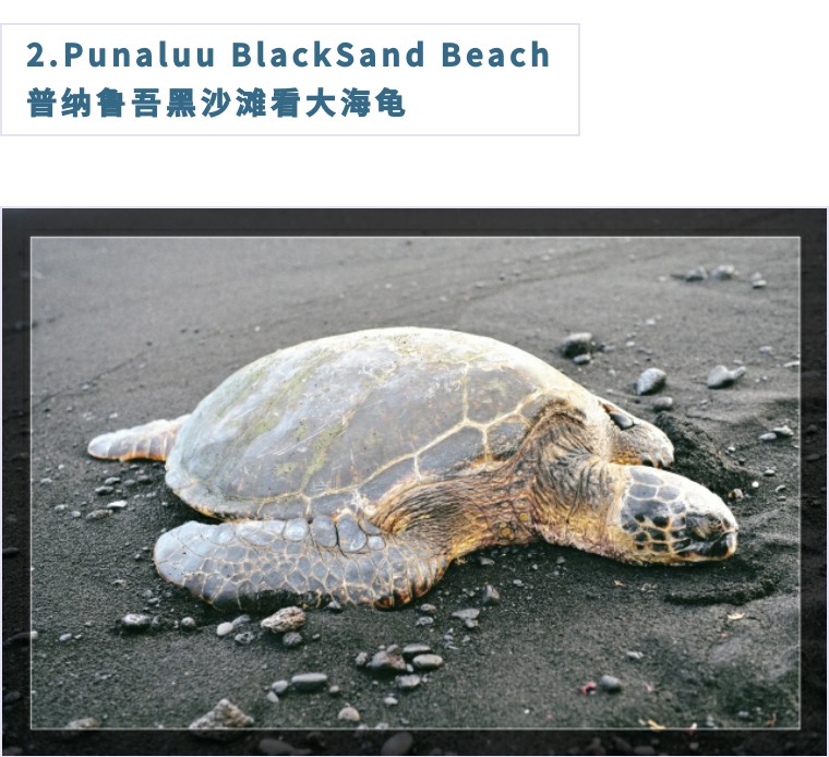 从火山公园继续驱车向南边行驶,就可以来到普纳鲁吾黑沙滩,之所以前文没有提到此海滩,是因为这里不是负责潜水游泳的,而是为了坐等爬到岸边来晒太阳的海龟们。像我们运气这么好的话,就能看见海归们排排坐!偶尔游客们也会去和落单的海龟来个保持十公分距离的友好合影,素质杠杠的。