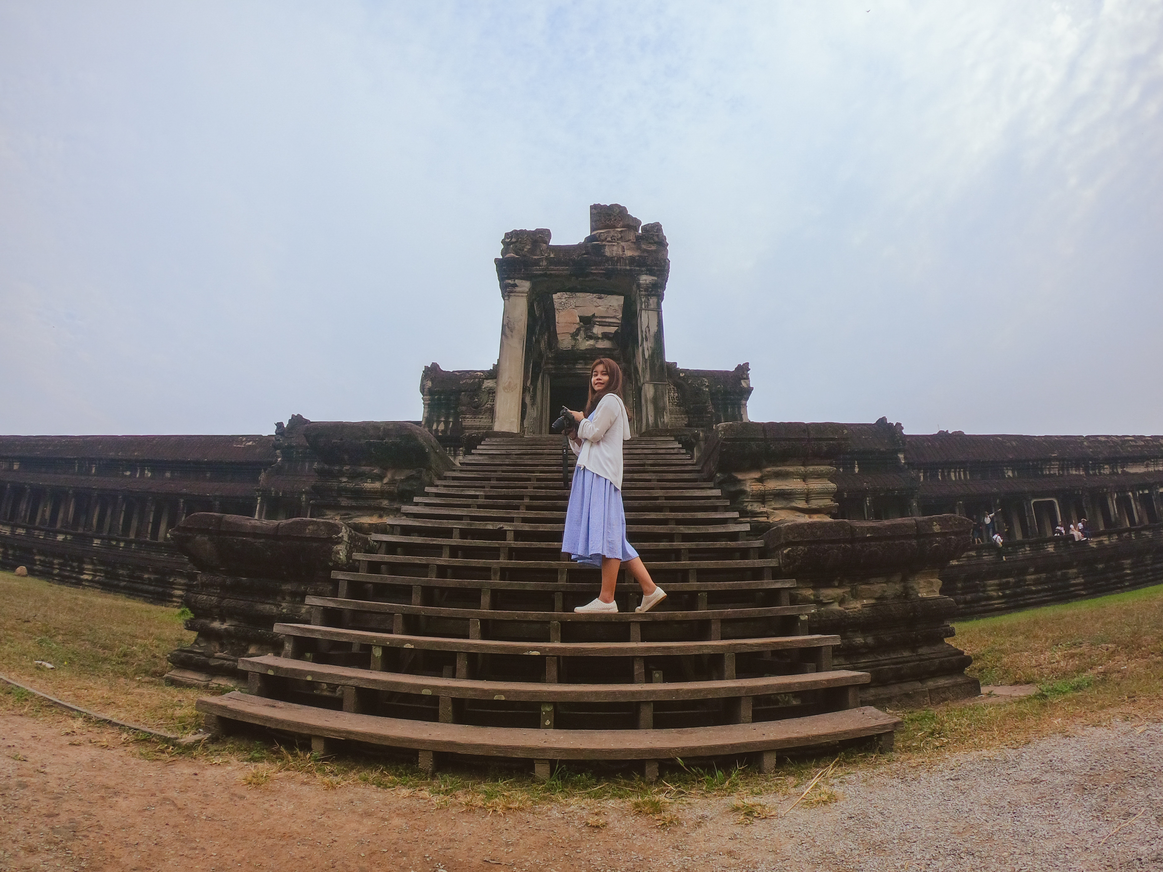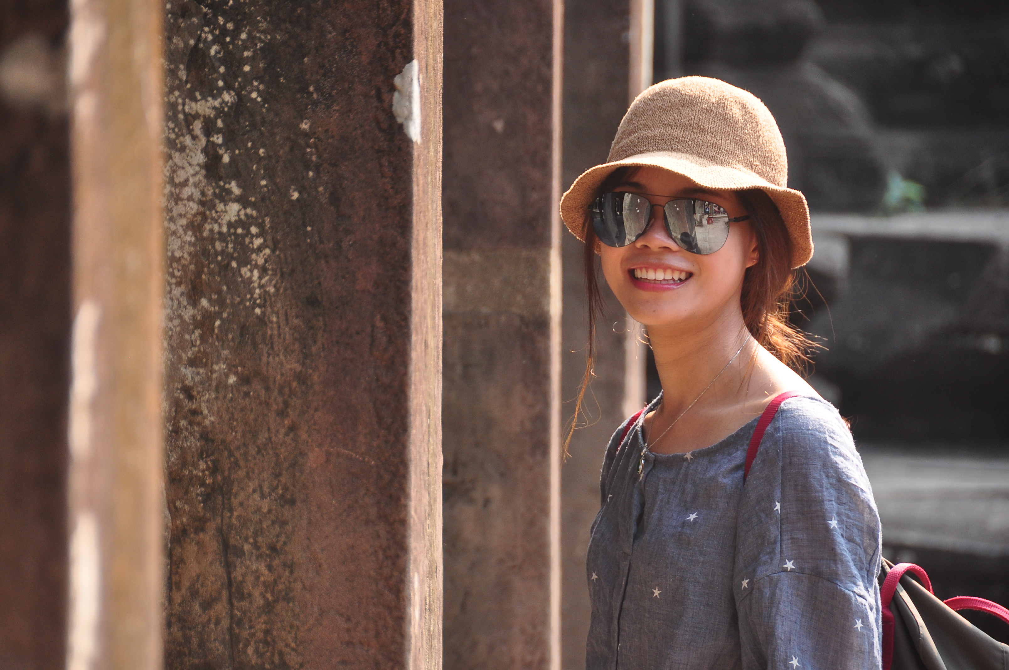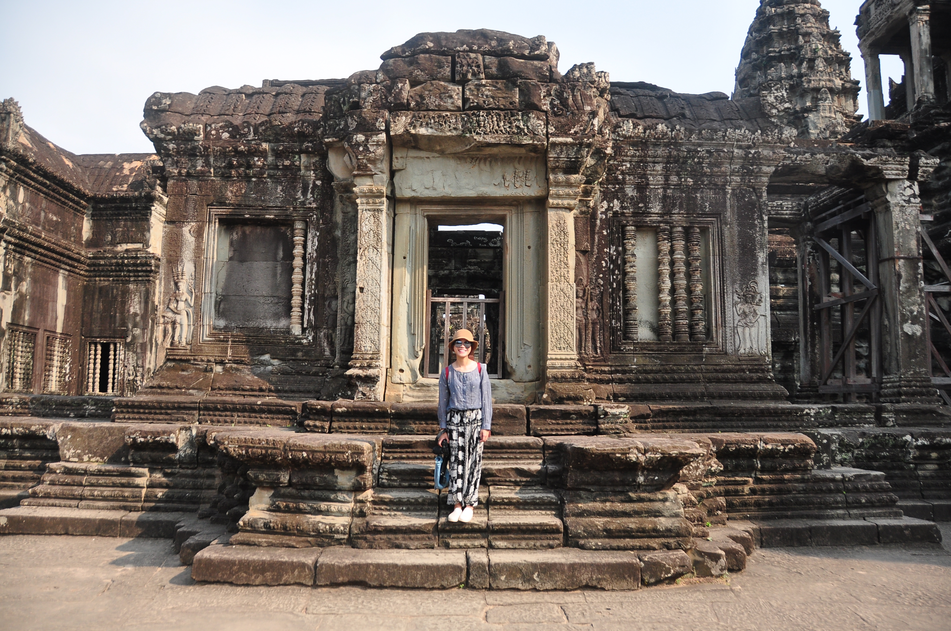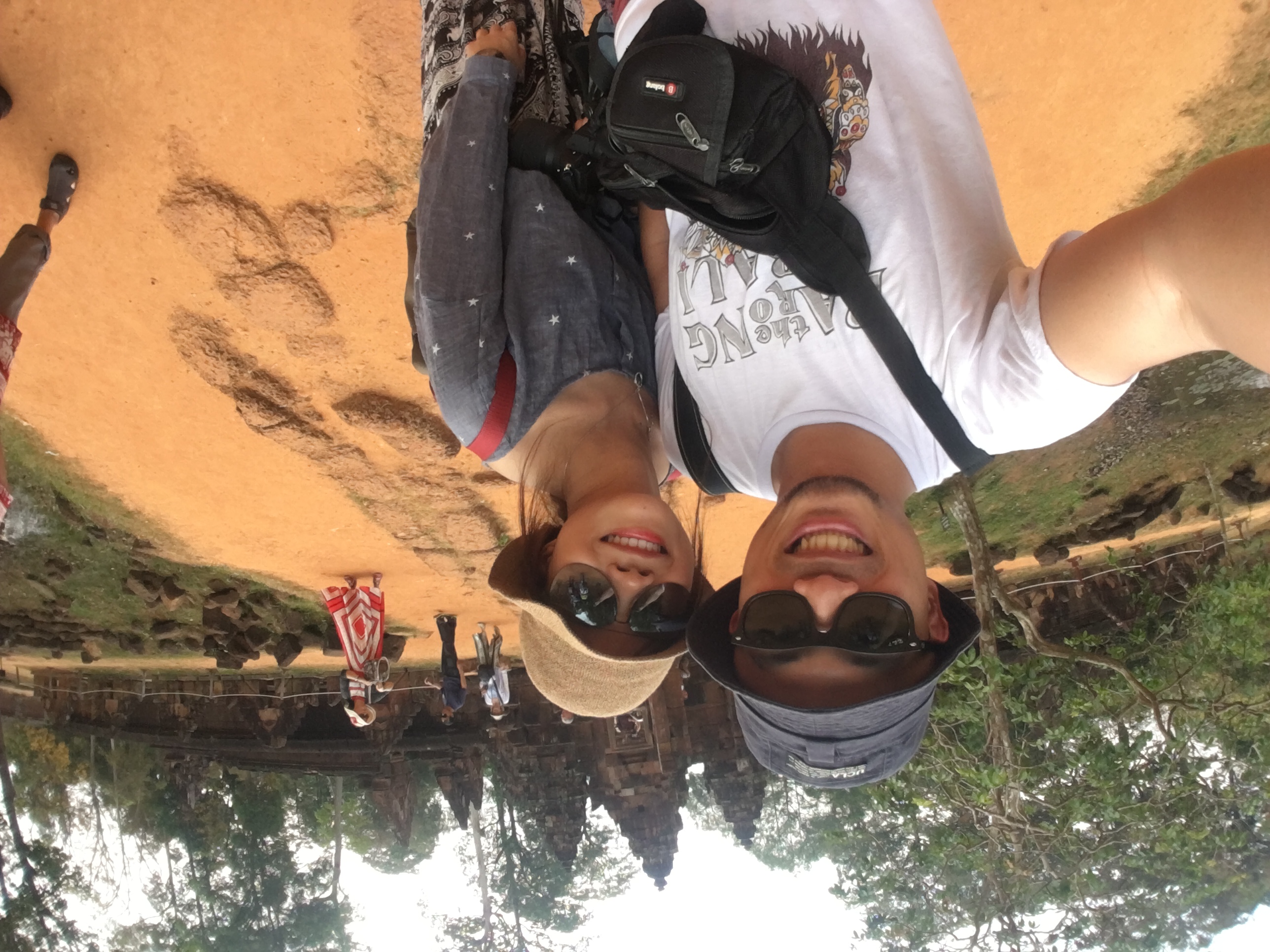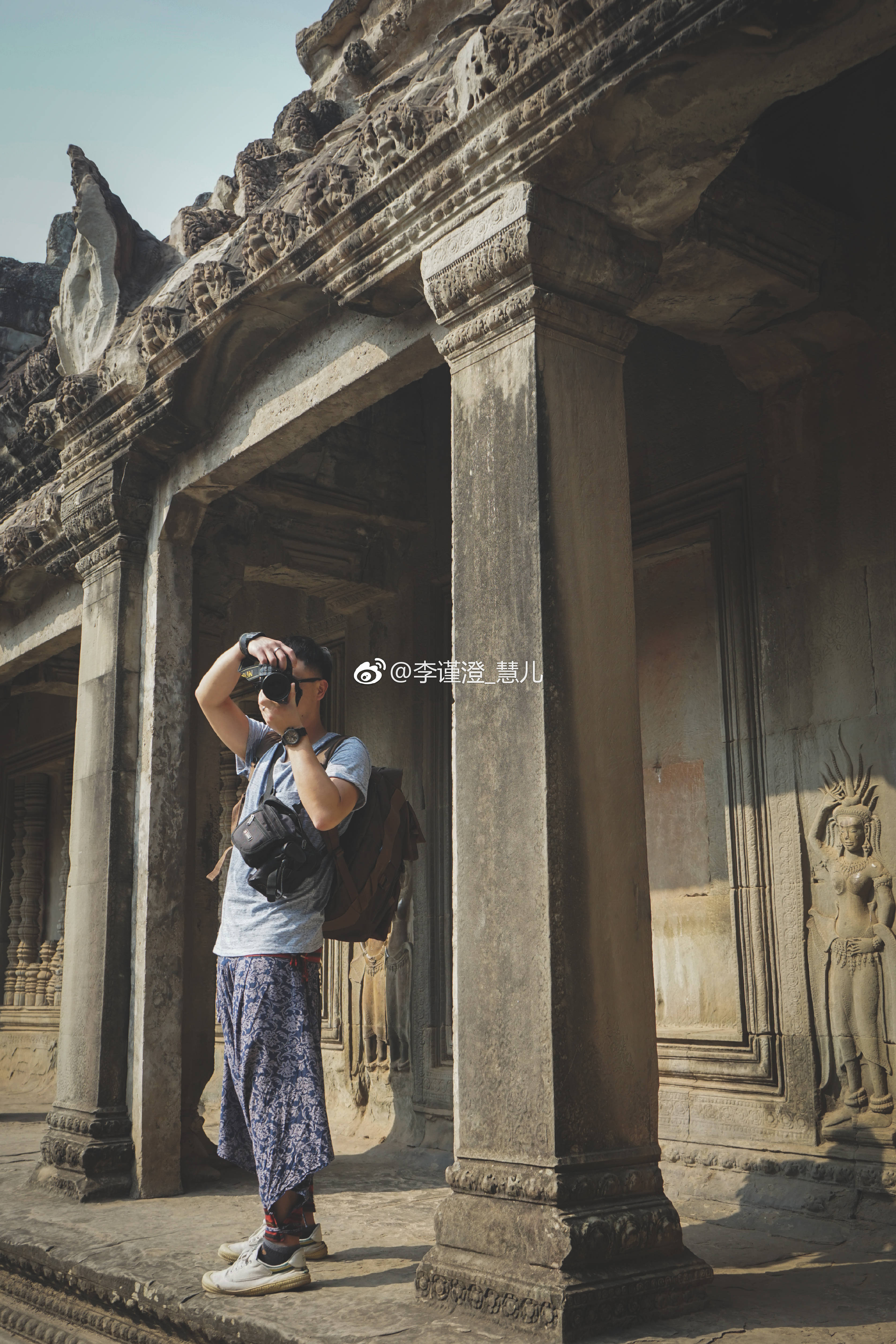 一整天的吴哥窑。我没有长裤,穿的是他的裤子,超长的哈哈哈。一开始他说不上去第三层的,可是后来他又在排队,可是我已经没有排队了,只能不上去了,那时候其实有点生气的,可是团友在后面咧,就只能自己一边玩去了。等到他下来,他说他在上面站了好几分钟,想让我帮他拍照,可是一脸懵逼的我哪知道,他就只能拍我了。