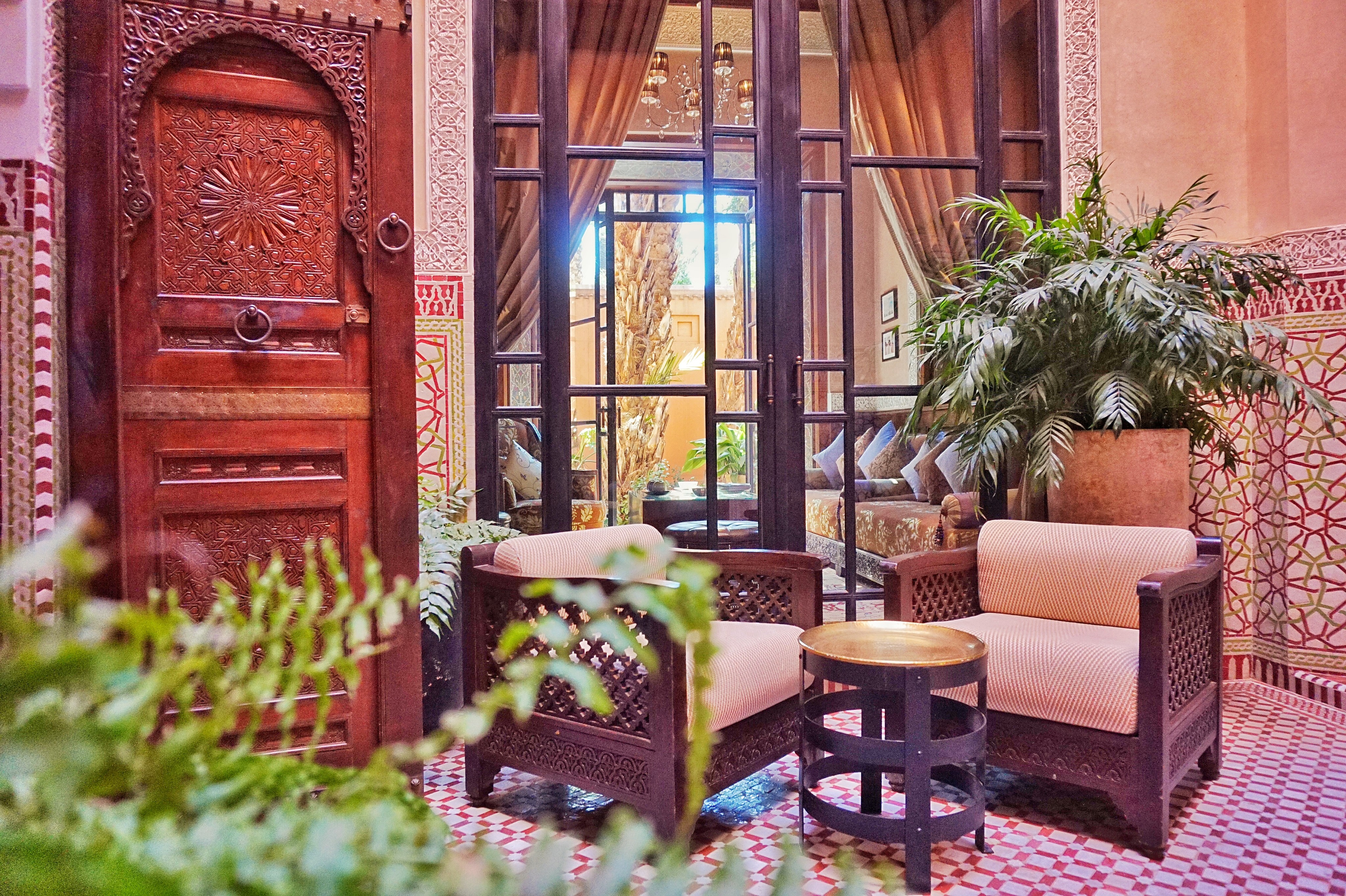 这是进入屋子的天井处。 一楼是客厅和餐厅,二楼为卧室,三楼有个露台。有管家服务,入住就有茶点送到房内,肯定少不了摩洛哥的薄荷茶啦。