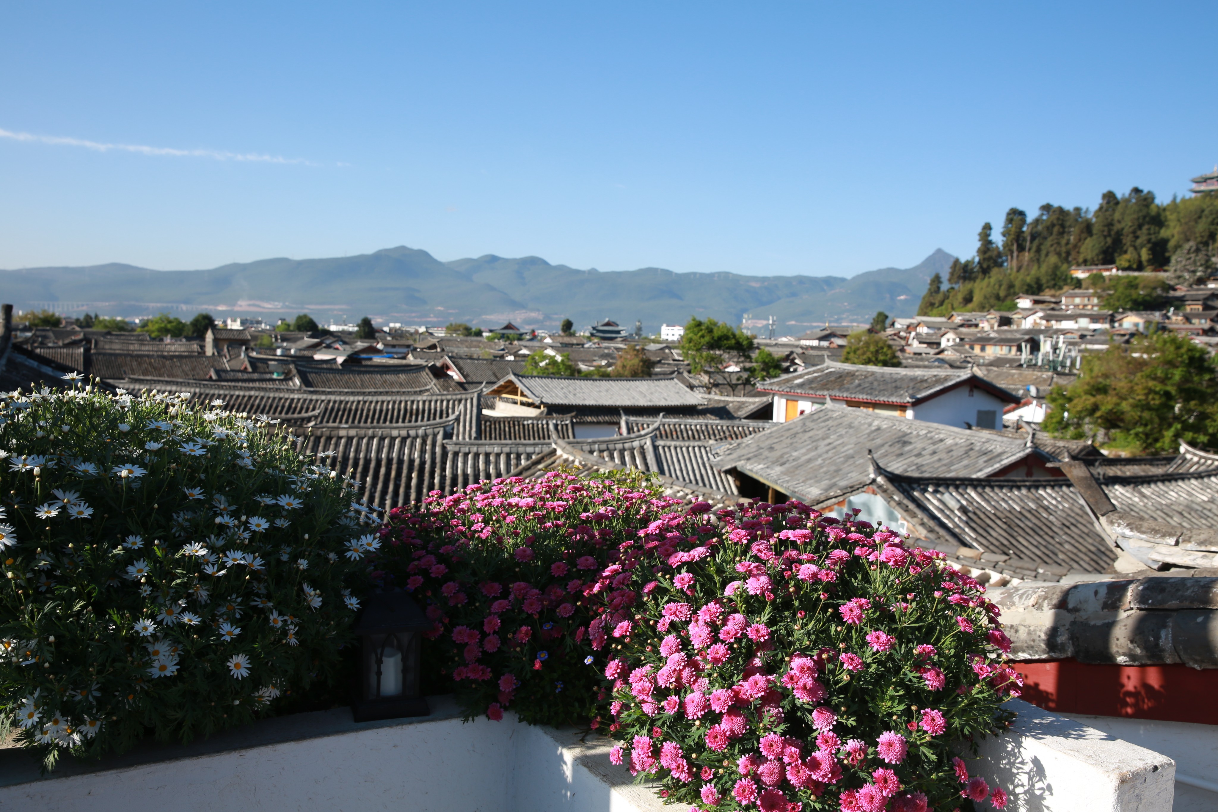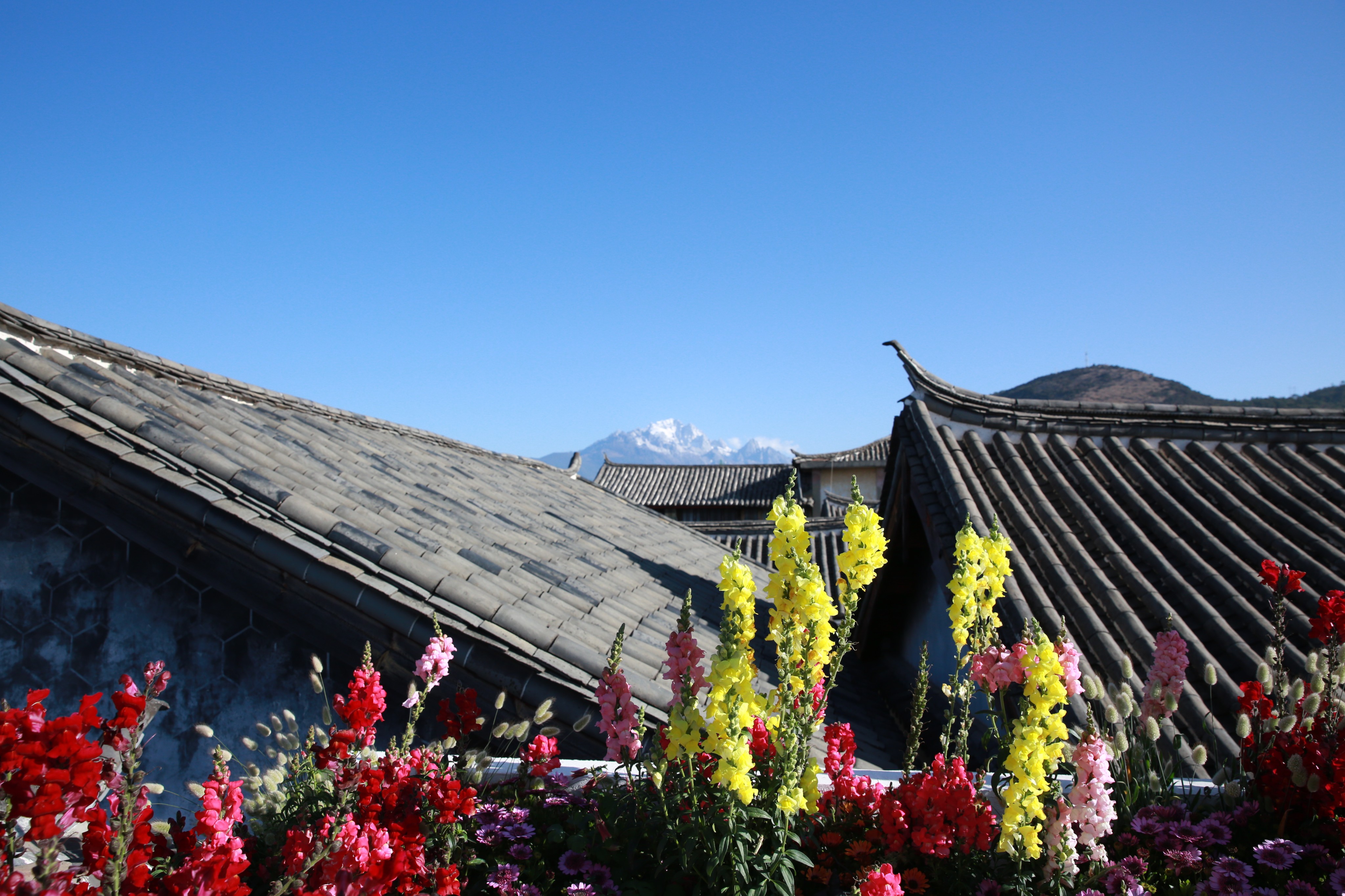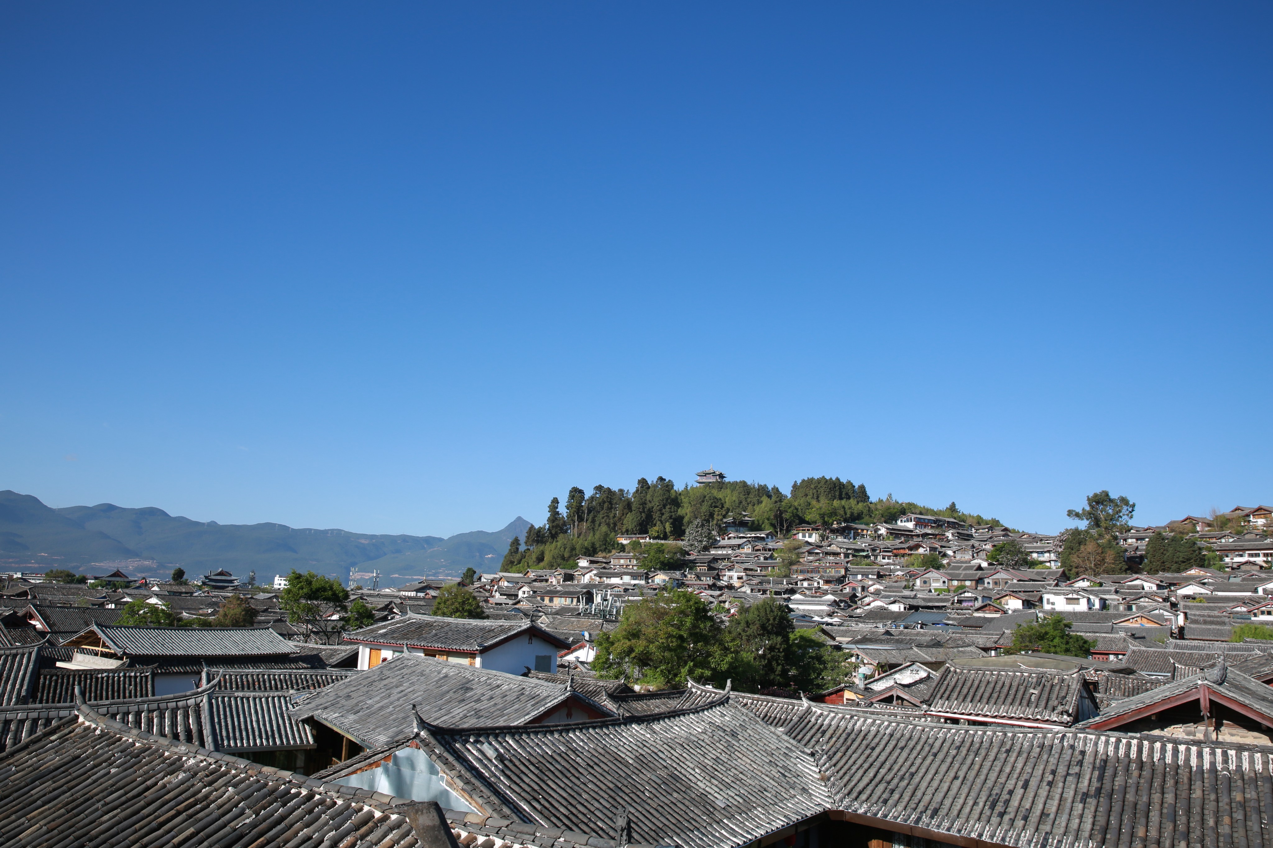 下图这个远远望去,白白山顶的就是玉龙雪山了: