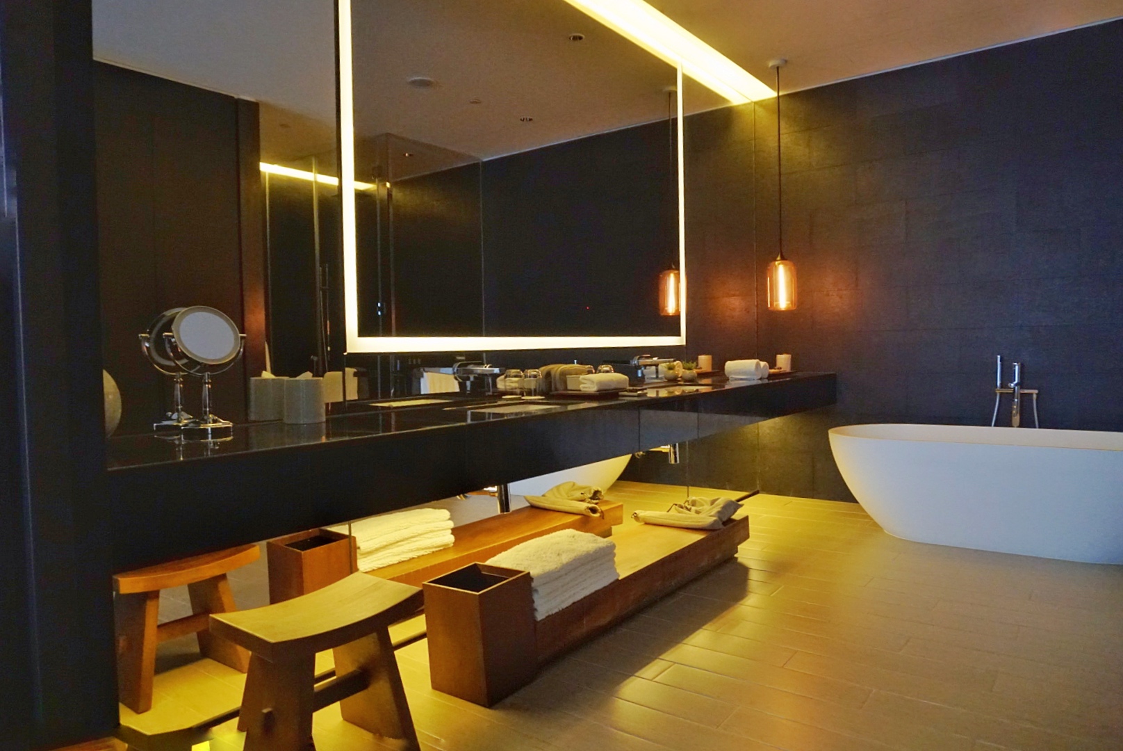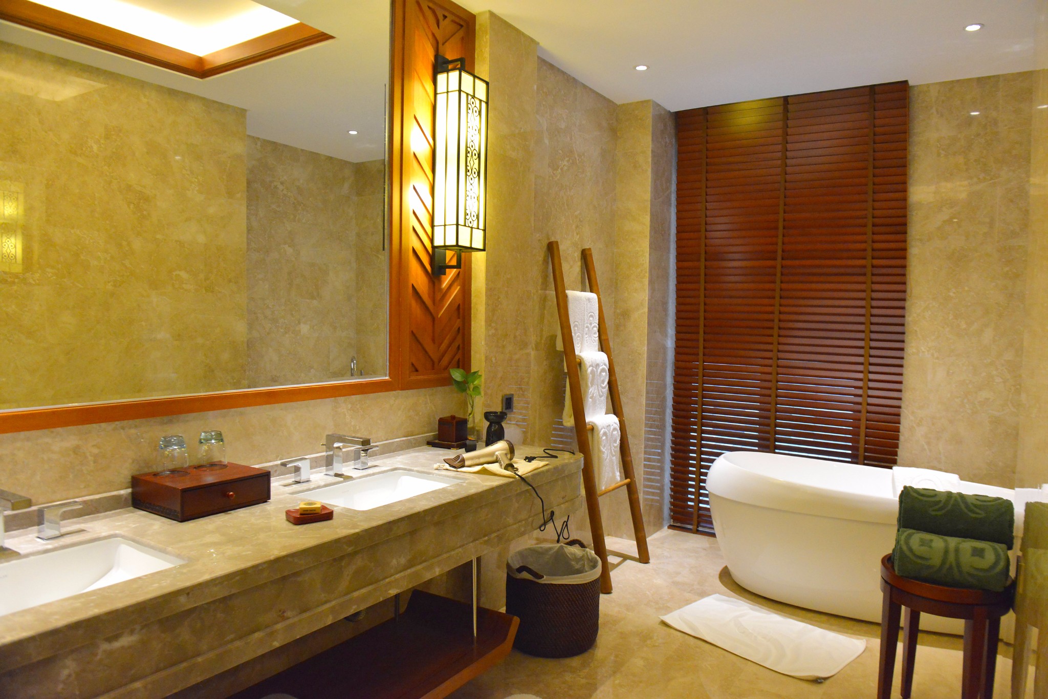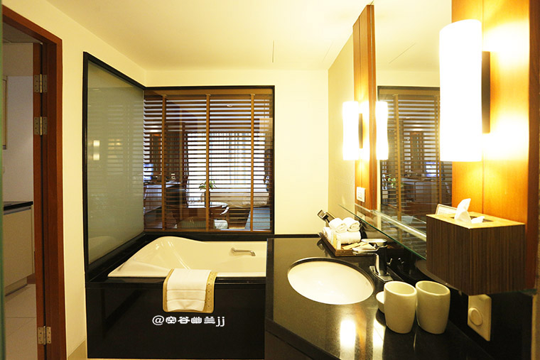 浴室就更体贴了,除去常用的一些浴品之外,博舍还准备了旅行包,便携化妆镜,泡澡还备好了搓脚石,为女性旅客考虑周到。可能唯一的缺点就是灯光略微昏暗了些。 22.朱家角安麓酒店阳庭阁,120平,单晚房价3k5左右。