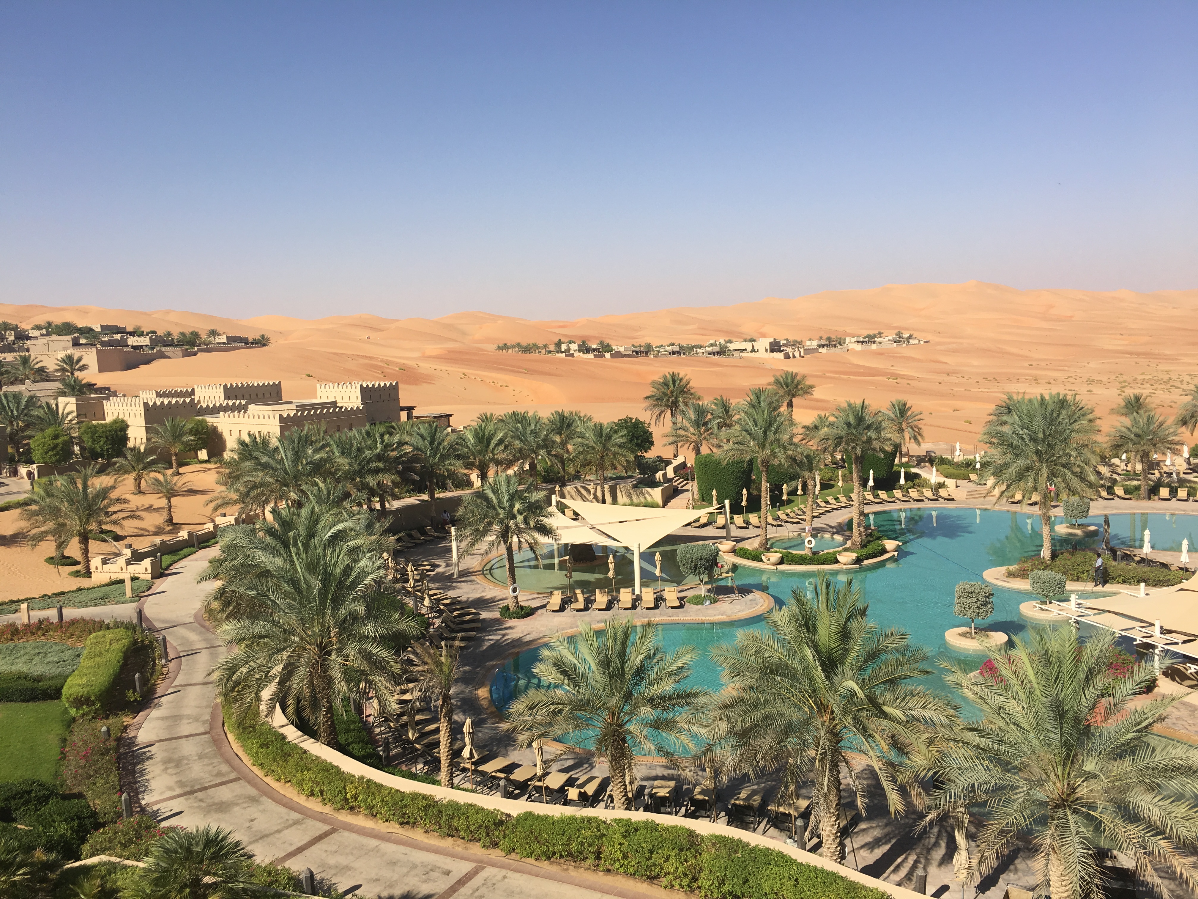 距离阿布扎比市区大约2小时车程,所有的水电煤全部都是从别的地方造管道接过来,缺点是住在里面只能玩沙漠,方圆百里什么都没有,但是该有的都有,比如有个巨大的泳池。