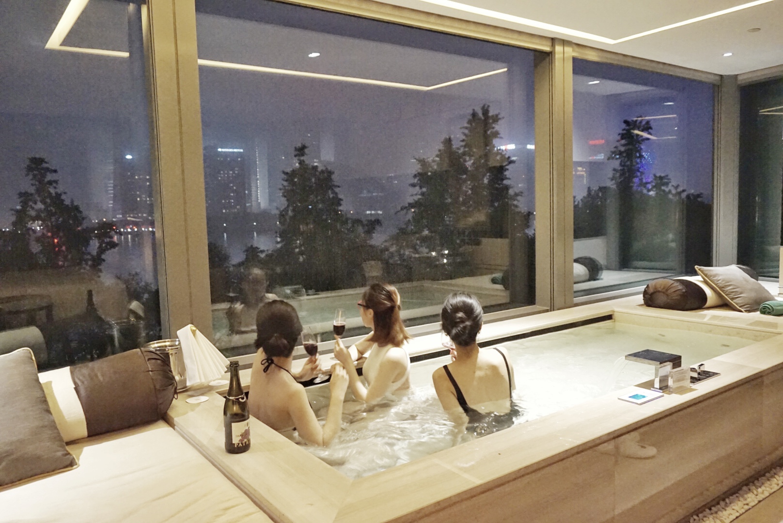晚上水上乐园结束营业之后,整个屋顶就被你承包了,感觉爽爽哒。房间内还有单独的按摩房,可以直接叫人到房间按摩,还送小点心和下午茶到屋内,都是免费的。还有专门的管家替你服务。10.上海外滩悦榕庄悦心池浪漫江景房,66平,单晚房价4k5。
