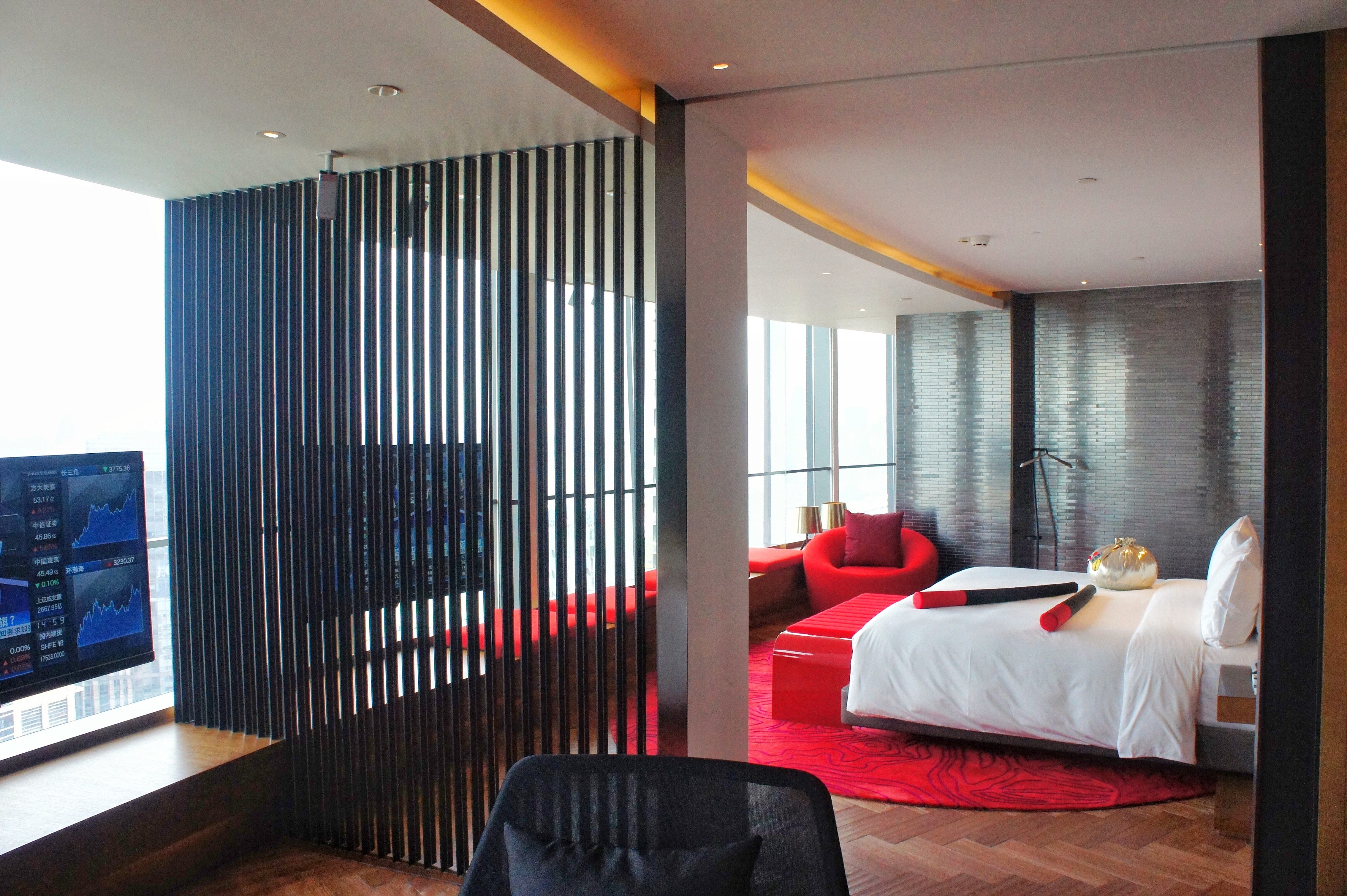 但是房间内饰真的是相当不ok,套房是W最高级别的房型,但是因为定位是高级情趣酒店,所以B格……emmm……而且看陆家嘴的房间比较有限,都是套房,普通房型看不了。