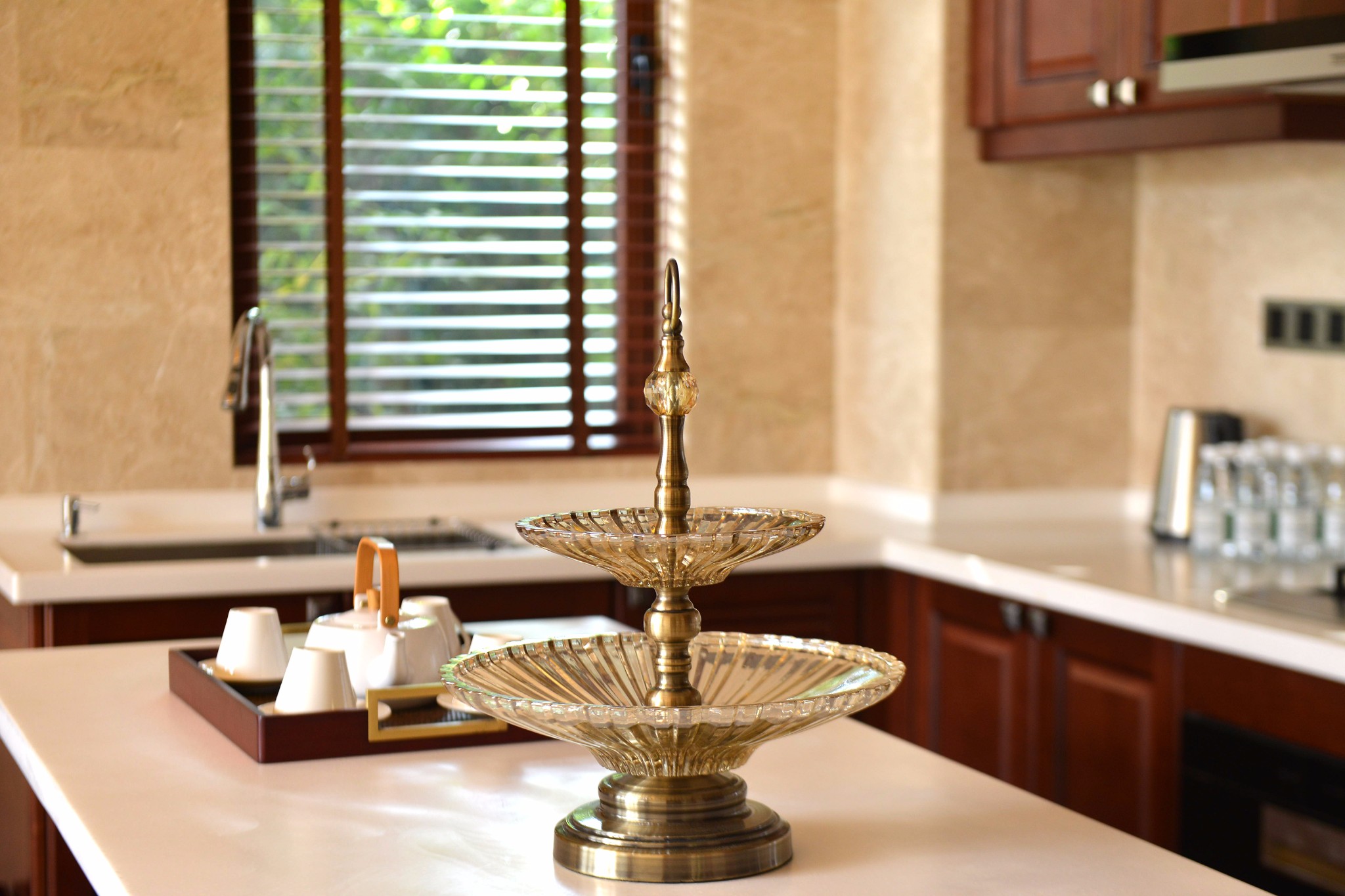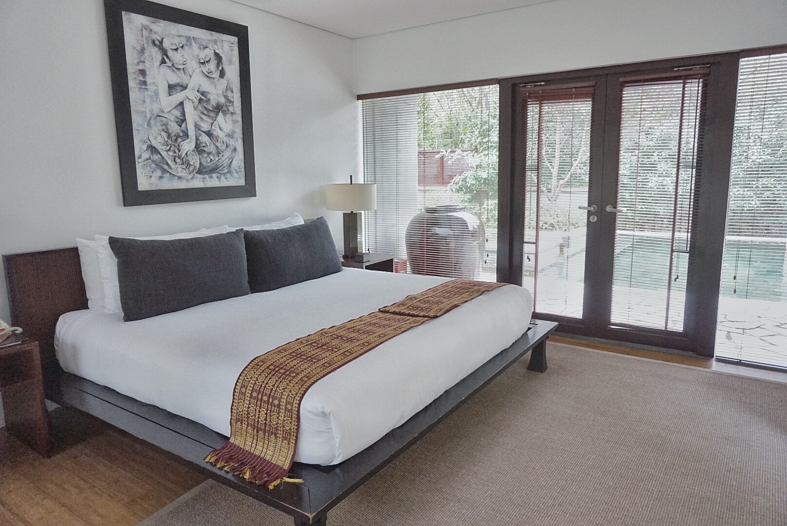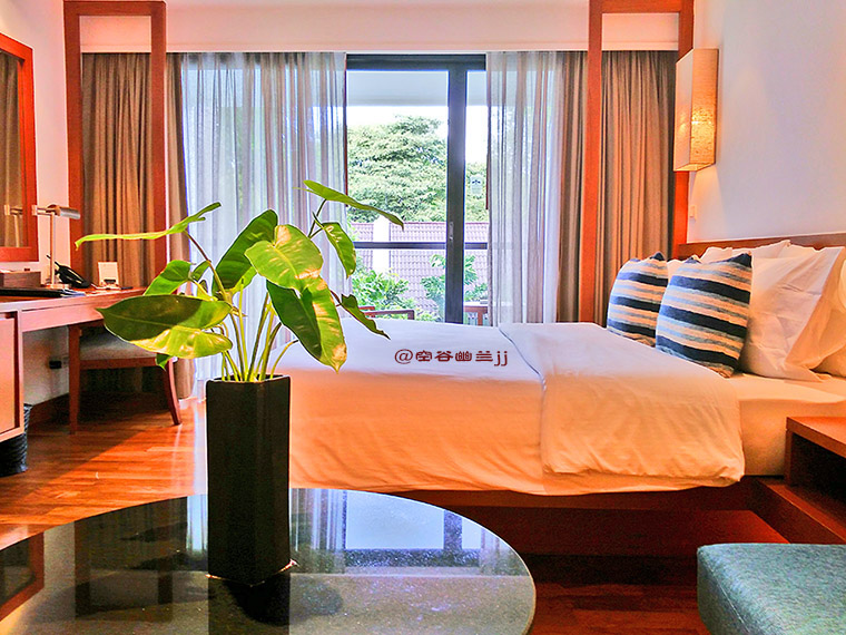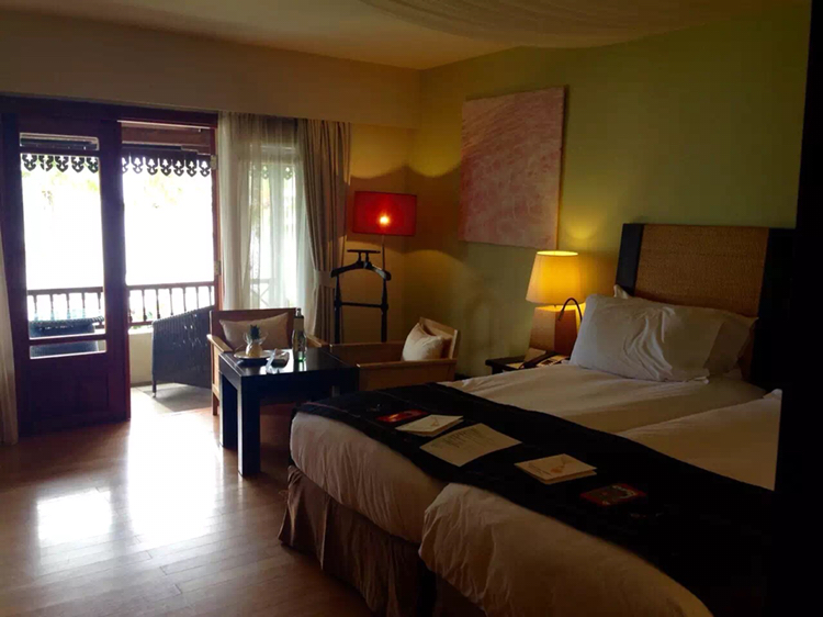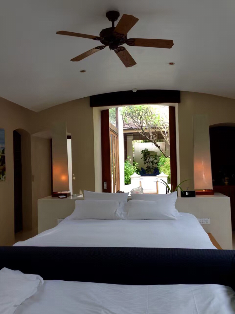 我们入住的是酒店的花园房,酒店为蜜月度假的我们贴心的安排了最靠近中央花园的房间,赠送了蜜月蛋糕和欢迎水果,宾至如归的感觉真好。房间布局和细节都精致优雅,宽敞明亮的大落地窗,素雅的桌凳和灯饰均与窗外的热带海景交互辉映,协调而舒畅。