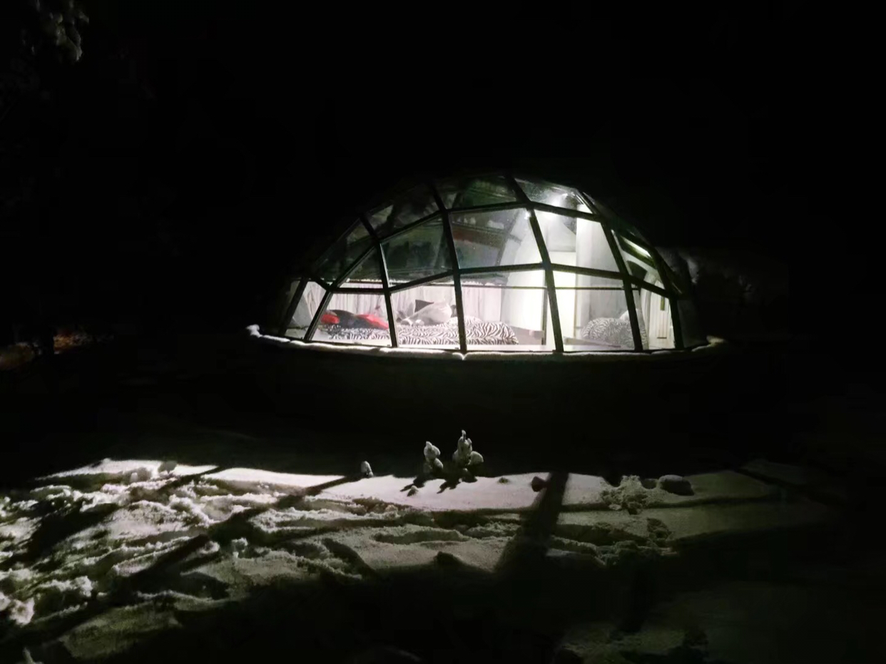 找到自己的房间迫不及待开门进去,里面果然很暖和~玻璃屋顶整个都是暖暖的。房间很mini,但是该有的设施都有,设计合理,屋顶的下半部分是有一圈围帘的,不用担心。