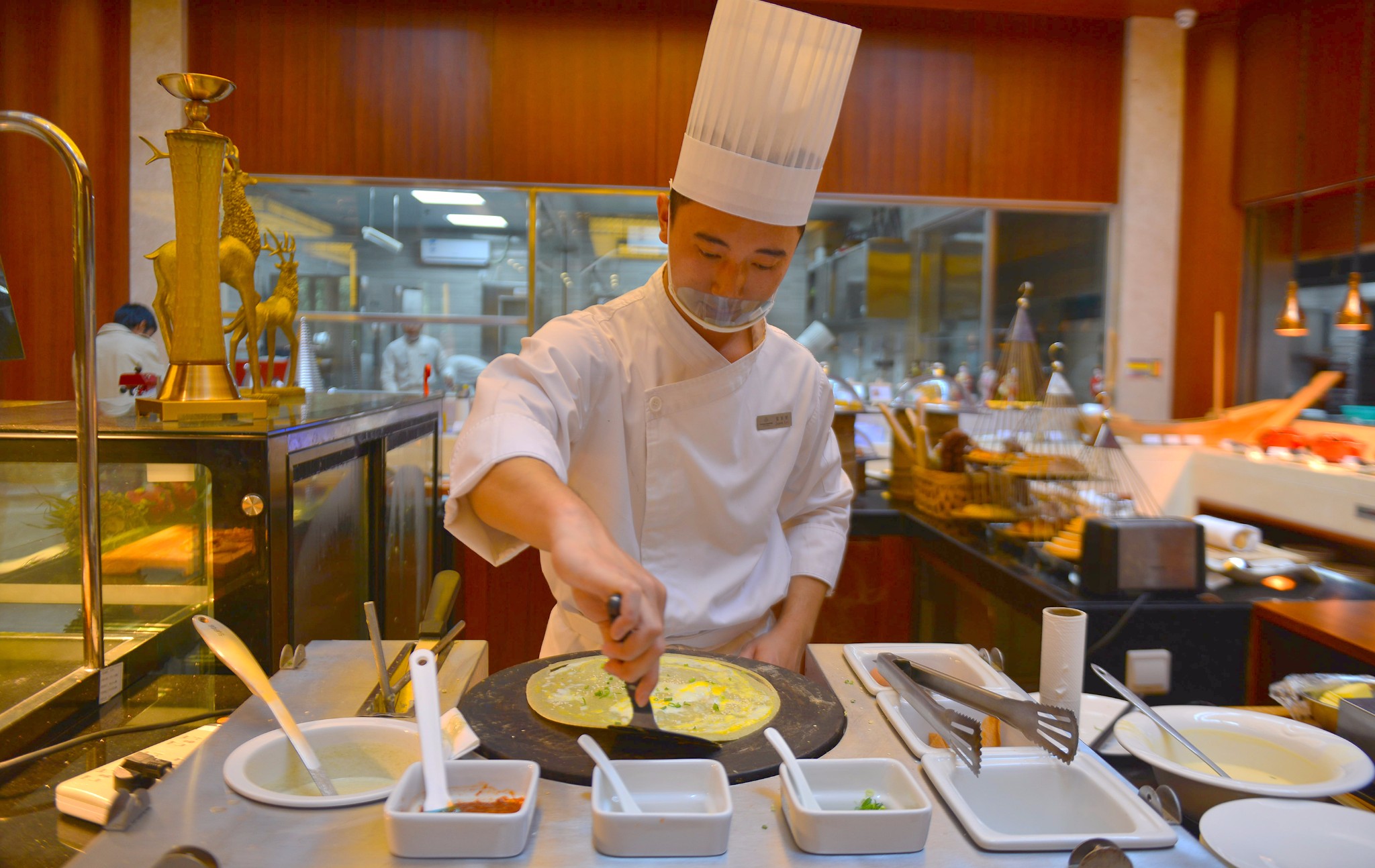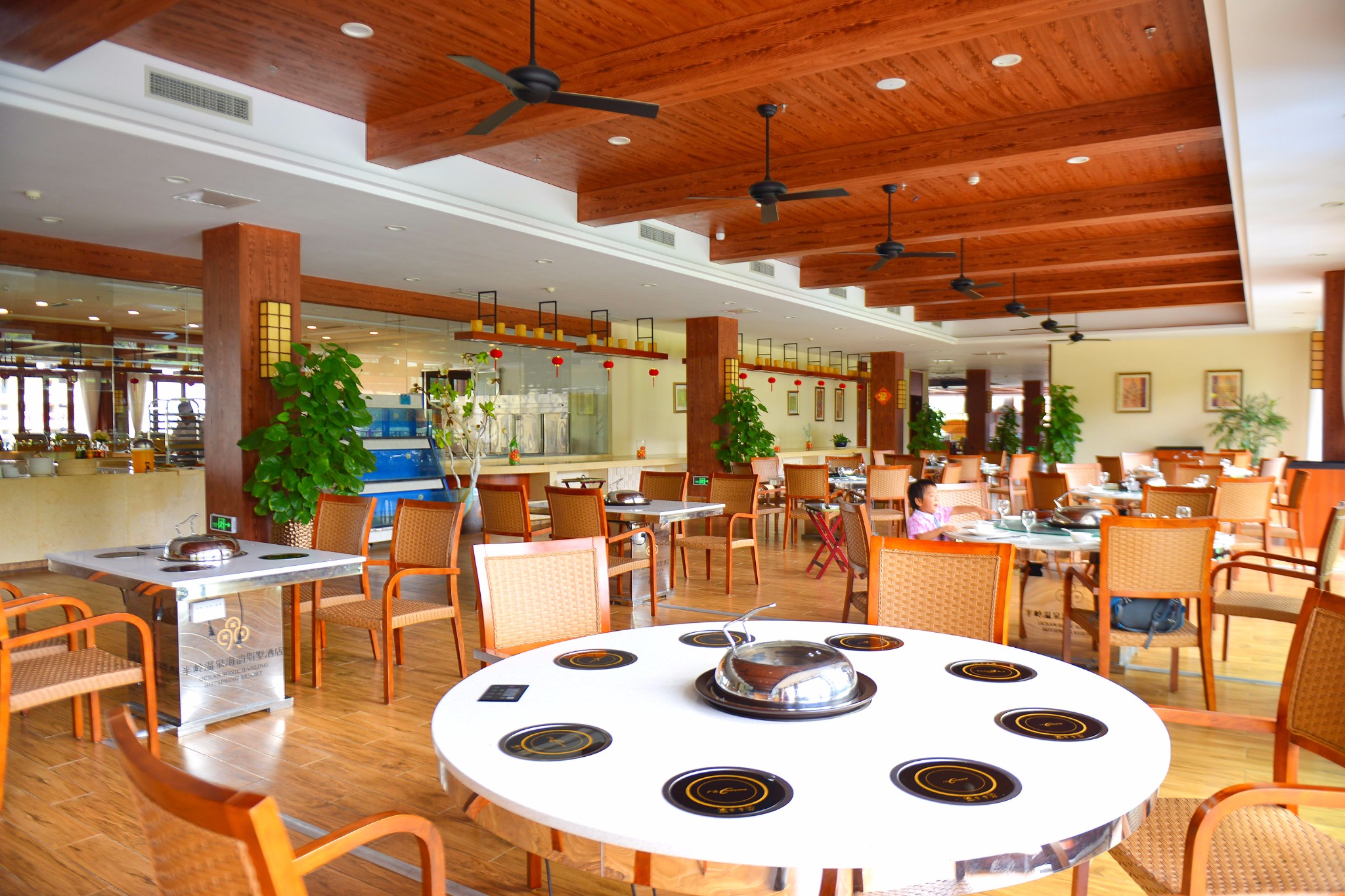 餐厅很大,可以坐里面,也可以坐外面,外面挨着池塘边,有各种小动物,还有真人音乐演奏。