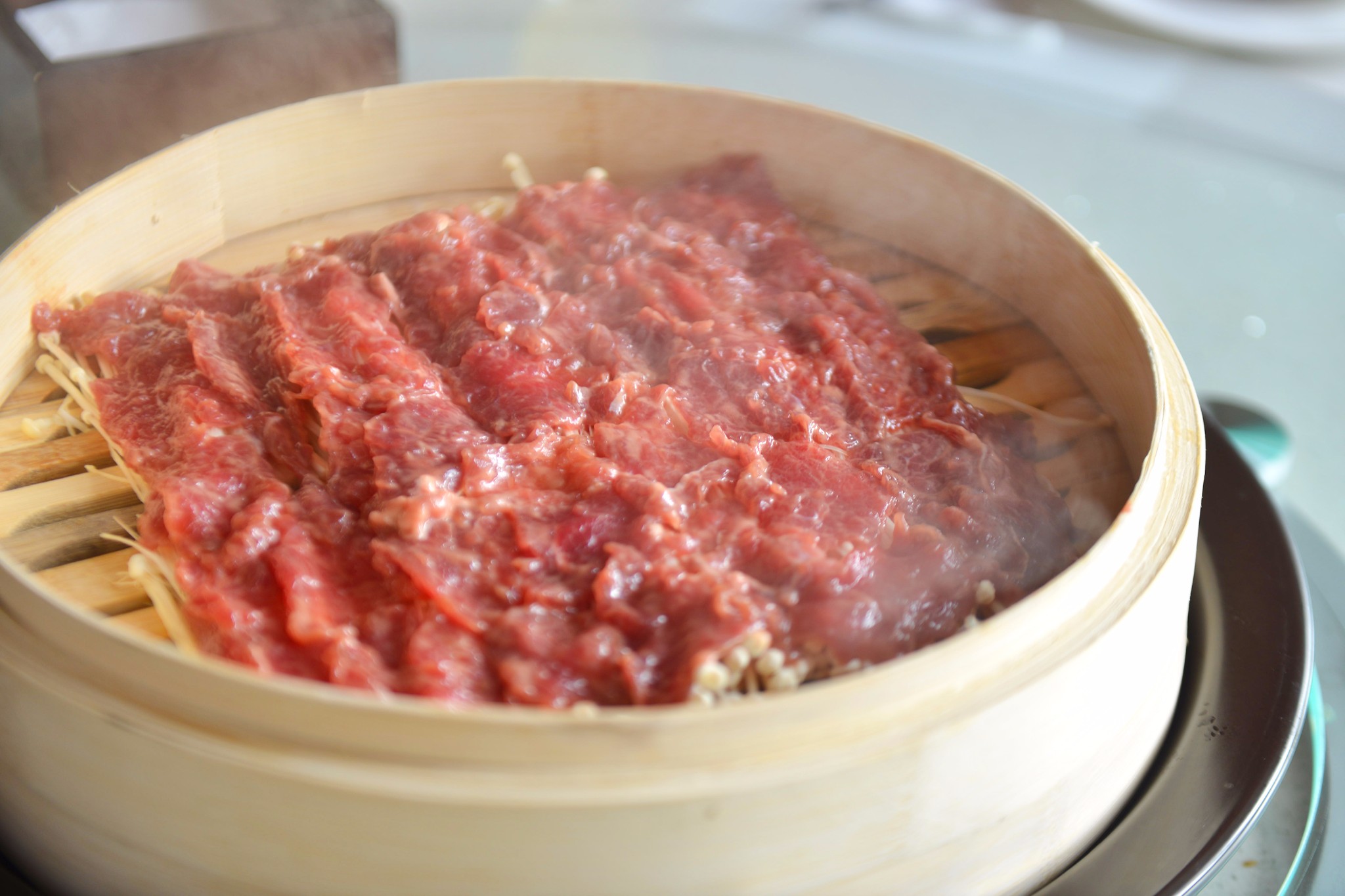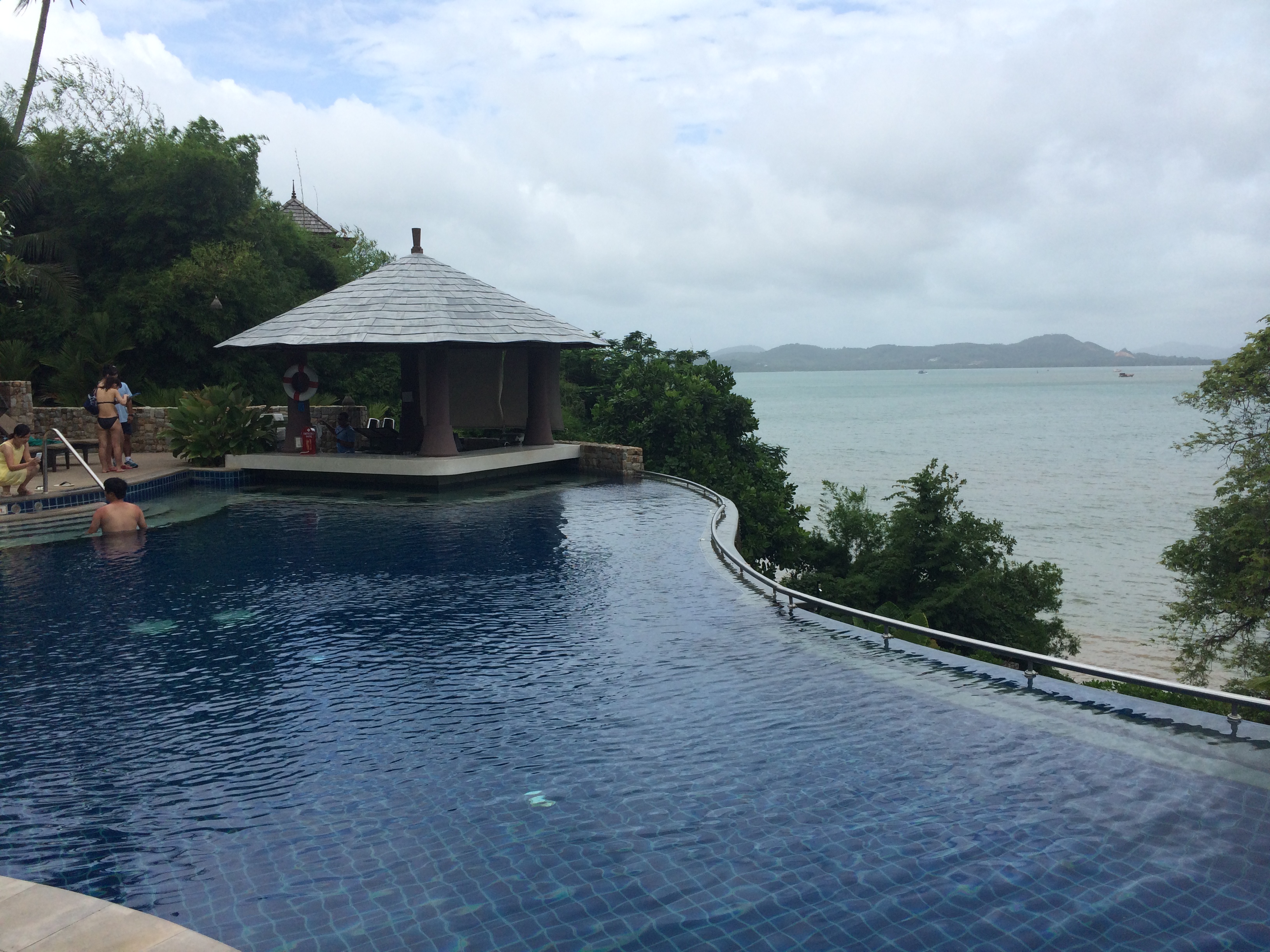 餐厅对面是泳池,再对面是蓝色的大海,画面很美。
