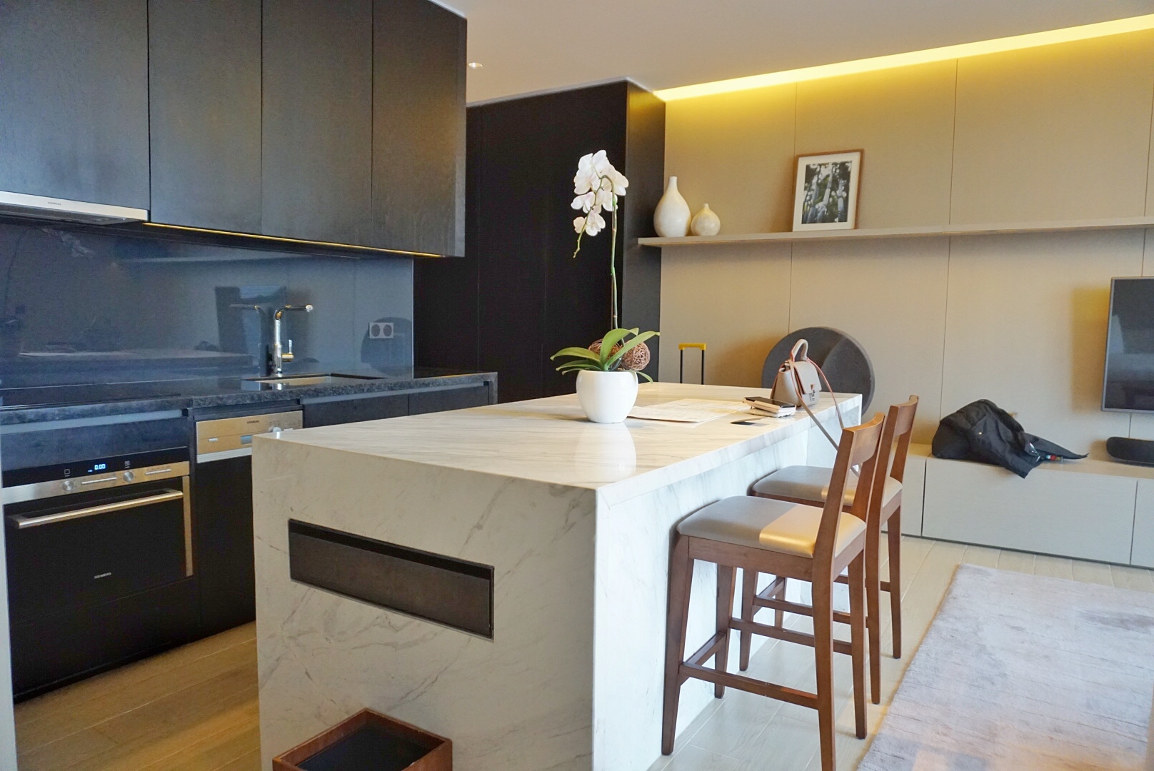 家庭套房内设有一室一厅一卫一厨,半开放的厨房锅碗瓢盆一应俱全,不过来成都就是为了吃火锅啊!厨房妥妥的用不上……床品相当舒服,迄今为止即首尔四季酒店的床品让我印象深刻之后,应该就只有成都博舍的床品了。